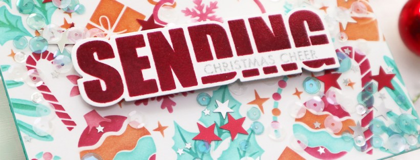 The sentiment is from the Bold Fill In Holiday set. I stamped “SENDING” in Lipstick red and filled the blank space with the “CHRISTMAS CHEER” by heat embossing it in silver. I then cut the sentiment using the coordinating die and added it to the card slightly tilted using foam tape.
