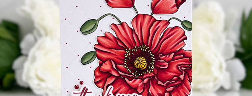 I began by stamping the beautiful Coming Up Poppies Stamp Set onto white cardstock with Caviar Ink. I colored it with Copic markers, then used the Coordinating Die to cut it out. I went in with a yellow gel pen to brighten up the stamen.
