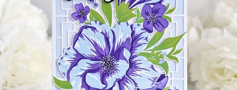 For the background, I die-cut the Convention Coverplate Die from white cardstock and layered it over a panel of light blue cardstock. The stenciled florals were layered together and adhered with liquid glue. The sentiment, from the Coming Up Peruvian Lilies stamp set, was white heat embossed onto black cardstock, cut out with the Coordinating Die, then adhered with foam tape.