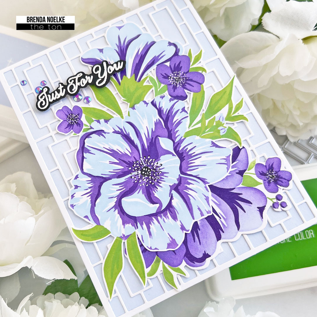 I began by stenciling the Sweet Bouquet and Wild Spray stencils with Arctic Sky, Iris Blooms, Grape Crush, Meadow, Evergreen and Noir inks. I used the Sweet Bouquet and Wild Spray coordinating dies to cut them out.