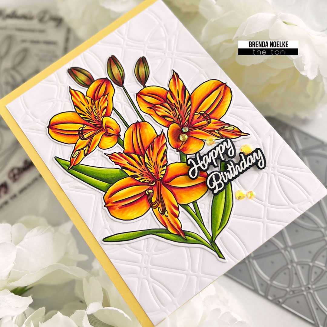 I began by stamping the image from the Coming Up Peruvian Lilies Stamp Set onto white cardstock with Caviar Ink. I colored it with Copic markers and used the Coordinating Die to cut it out.