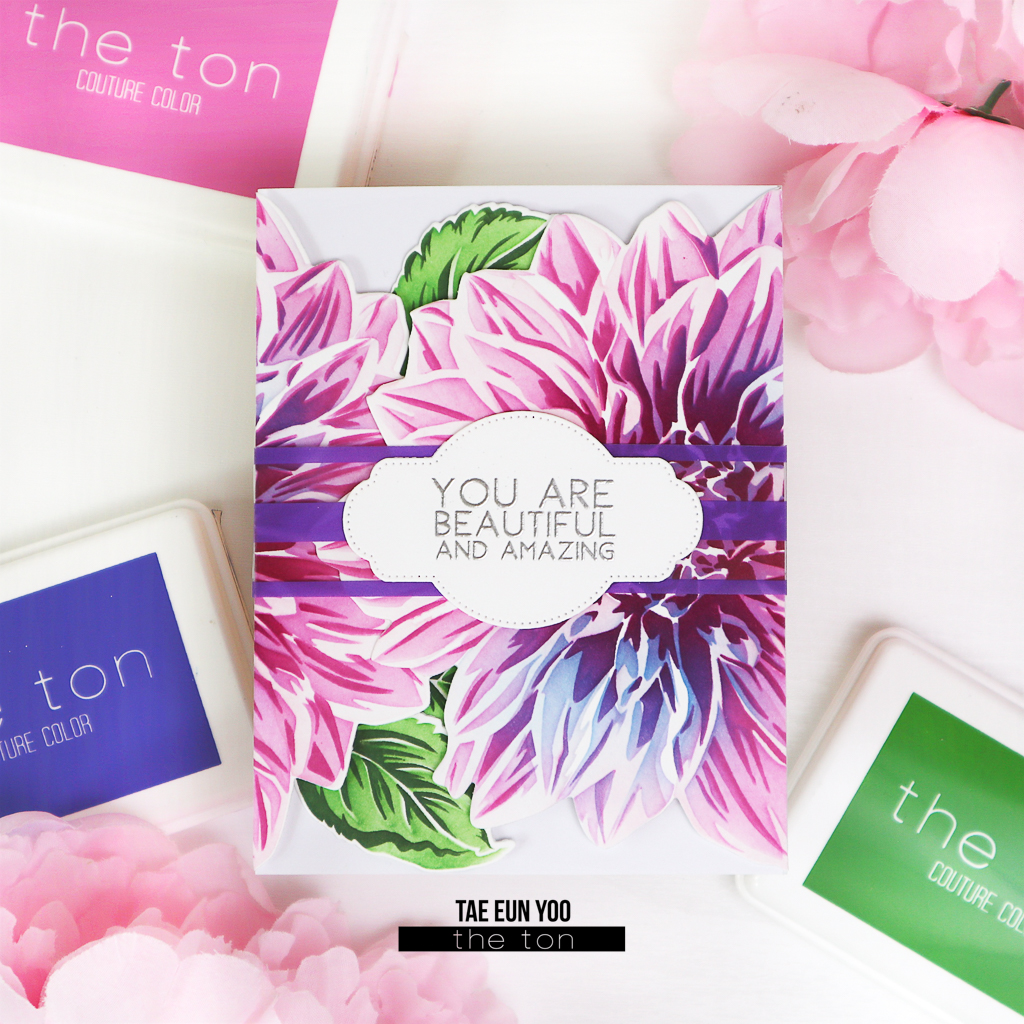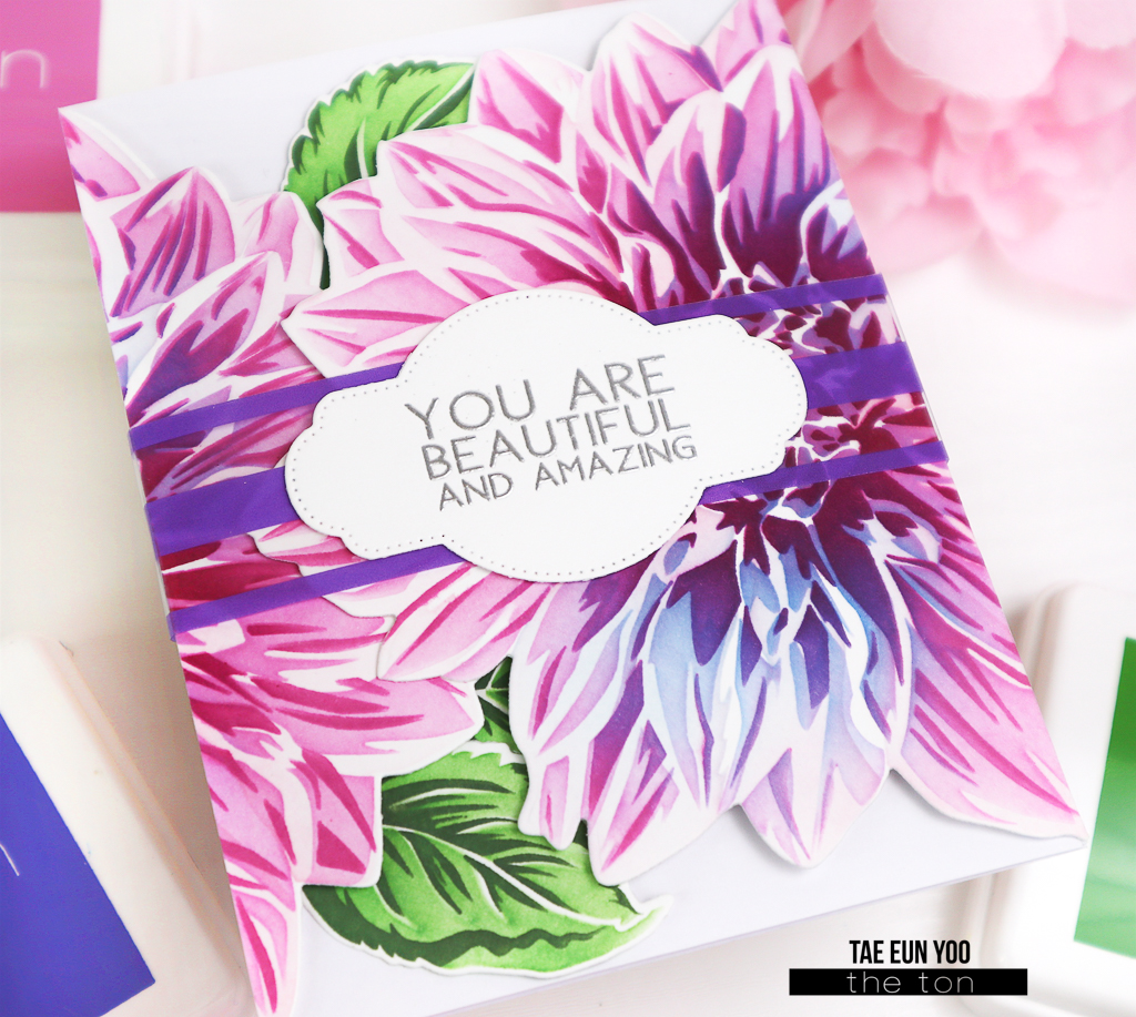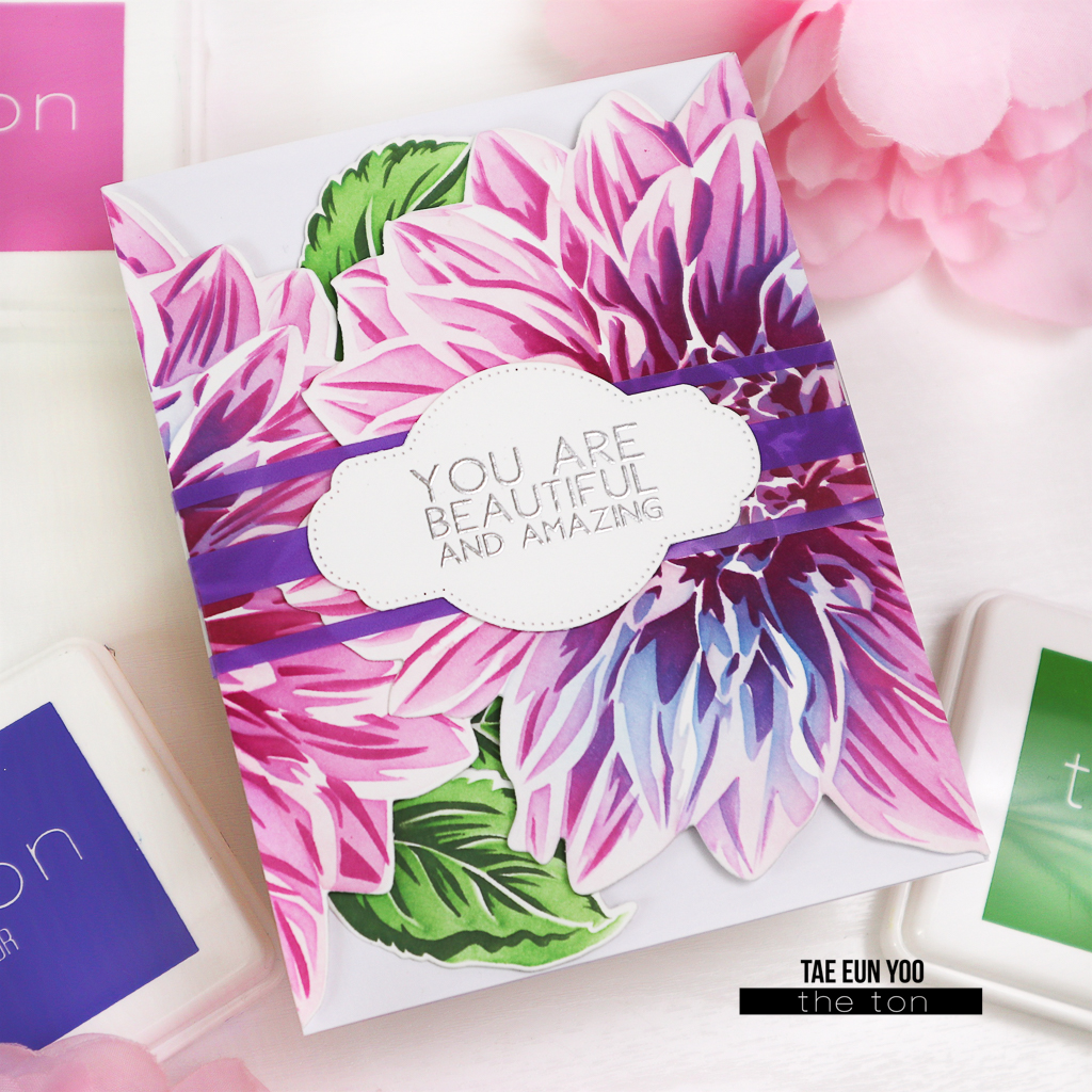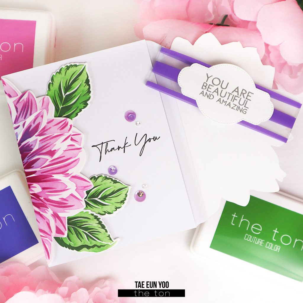 Hello everyone! Hope you’re doing well! It’s TaeEun here today with a trifold thank you card. I used the huge Darling Dahlia stencils along with the coordinating die set which are large enough to cover a whole A2 sized card.