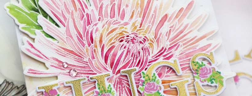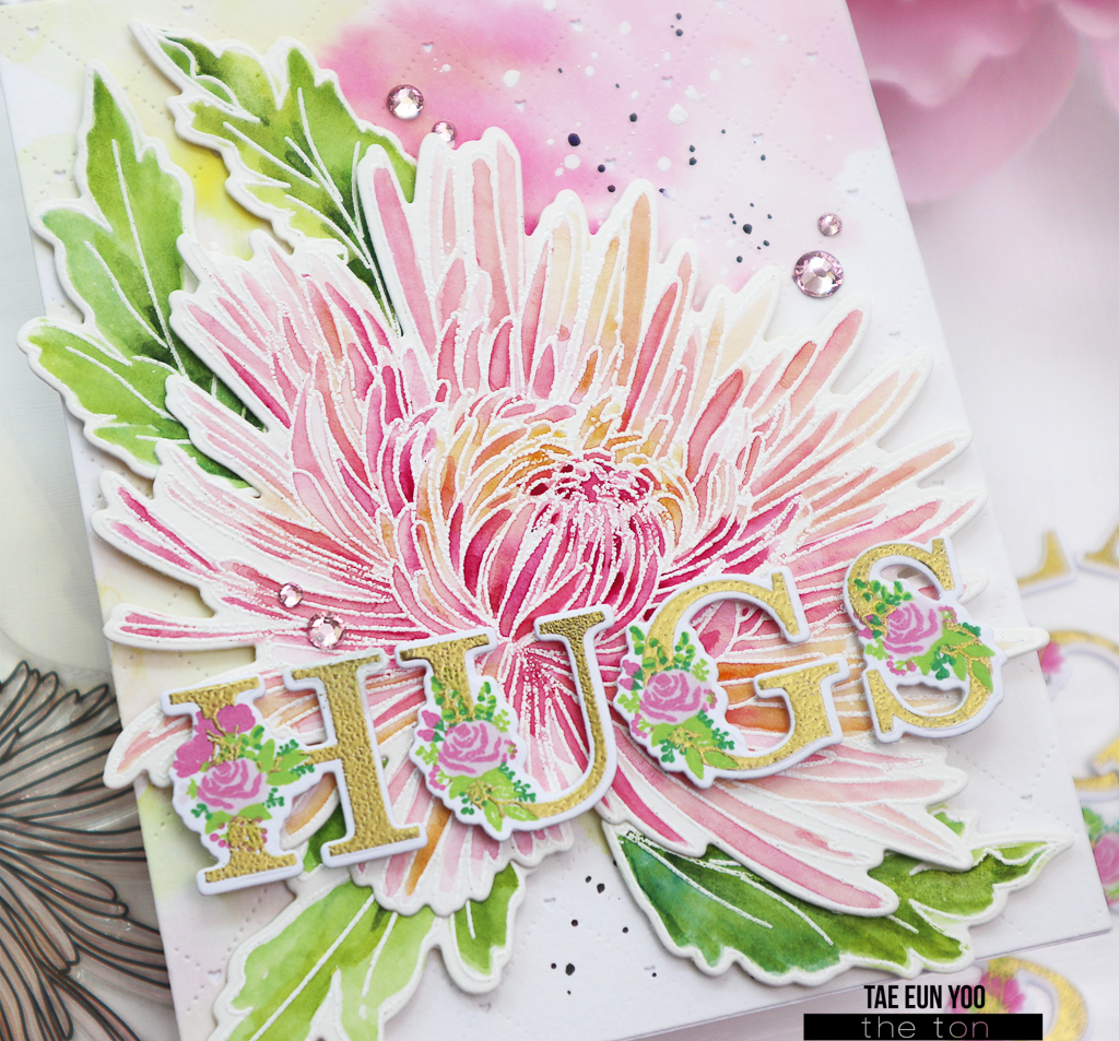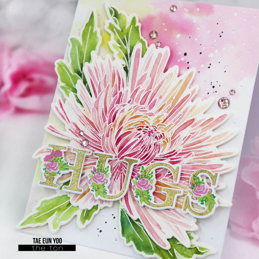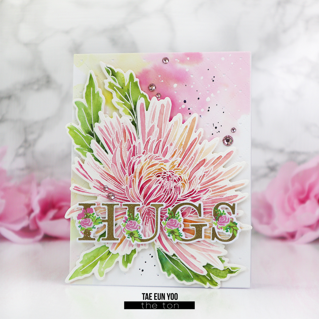 Hello everyone! It’s TaeEun here today with a watercolored floral card. I used the Jumbo Spider Mum stamp set and the beautiful Layered Floral Alpha stamp set from previous releases.