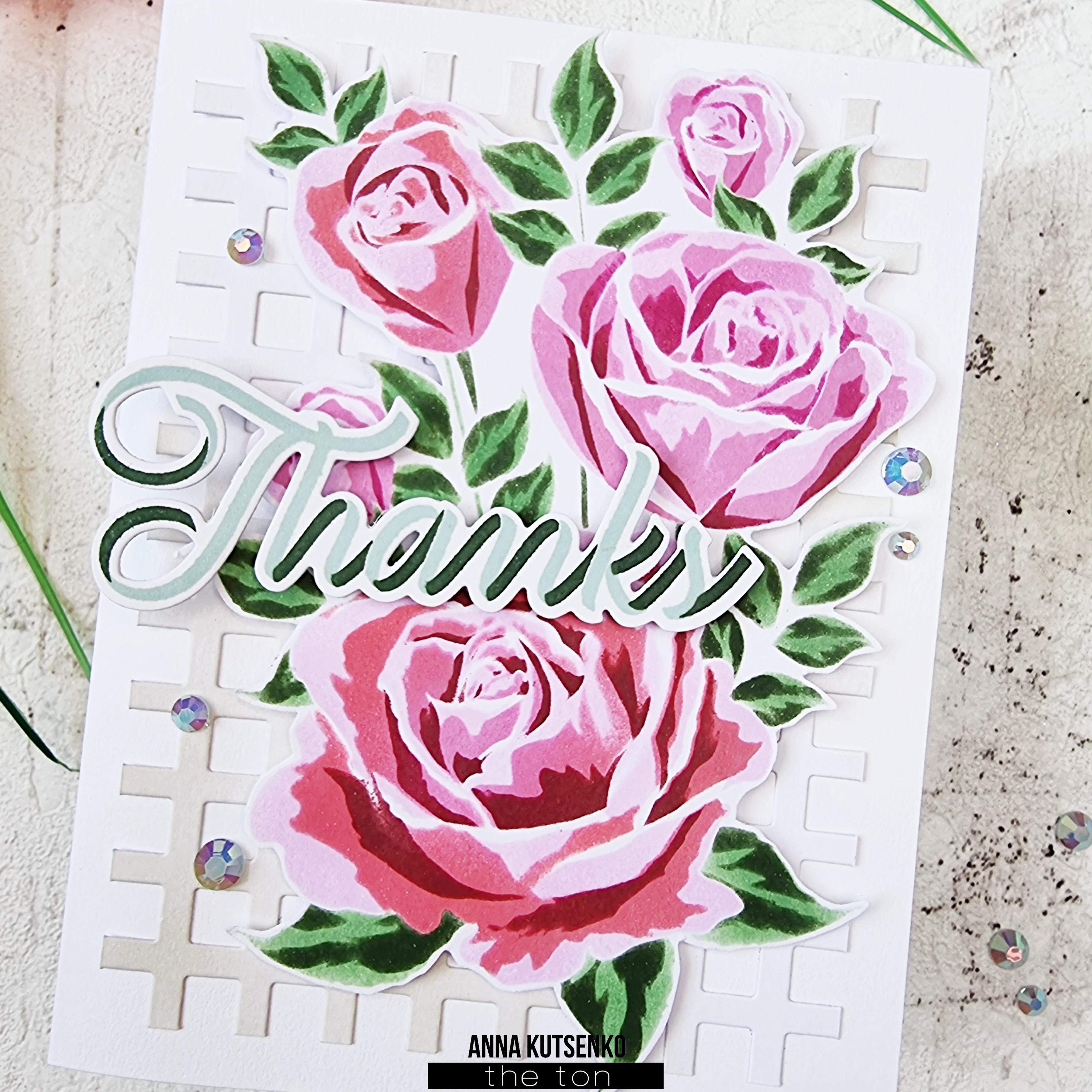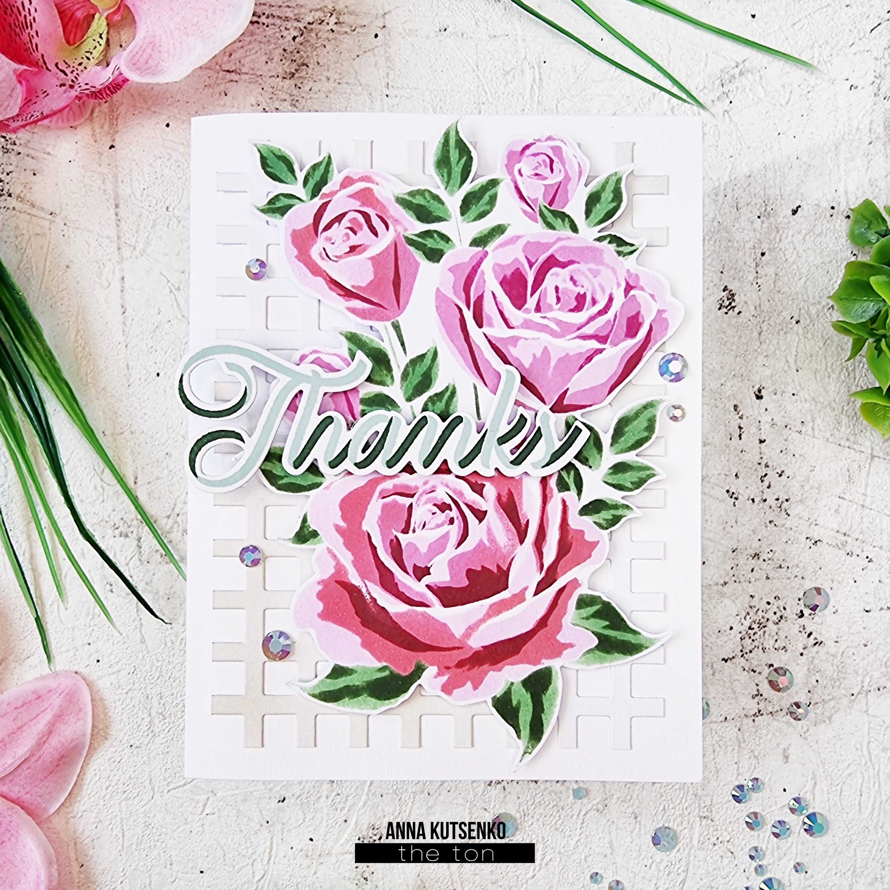 I started by stenciling roses image with Soft Orchid, Deep Peony, Cherry, Pink Derby, Wine (roses) and Vineyard, Everglade Moss (leaves). Then I fussy cut the image, but you can use coordinating die. To make the background, I ink blended Light Oat on a piece of white cardstock and cut it with Grid A2 Coverplate Die. I adhered the panel to a white cardstock card base and added roses bouquet on it.