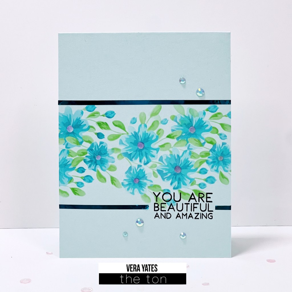 I also rotated the orientation of the stencil for the left and right side of the card as I did partial stencil on both side to get this look. Once I am done with the stencil, I stamped sentiment from Sweet Bouquet set. To finish I adhere a strip of Bright Blue Adhesive Foil paper to frame the flowers and added some mix size Seafoam Opaque rhinestones.