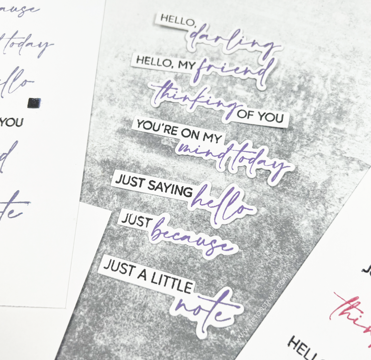 Next up is our Easy Expressions Just Because stamp set. It’s a 6×6 inch photopolymer set. This category of sentiments was requested by a dear customer so I decided to give it a go! This set can be layered easily using the patent pending strategic alignment marks embedded in the design. Then you can die cut all seven sentiments at once with the single coordinating die.