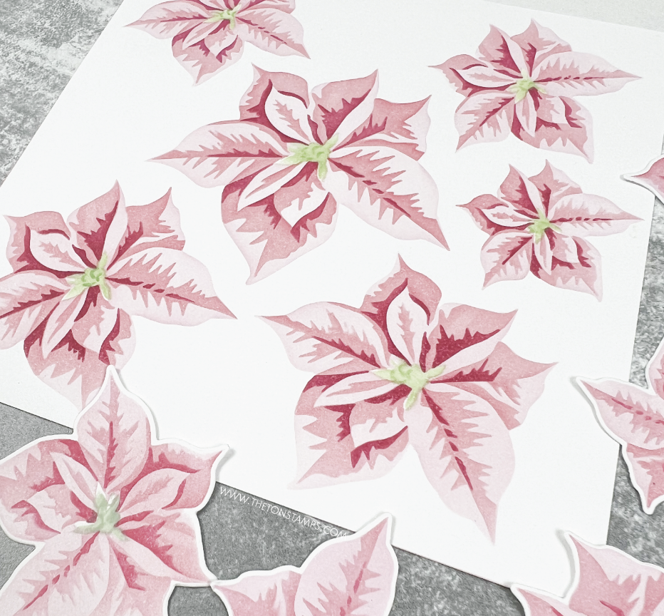 If you want to create your own cluster of poinsettias for your own holiday cards, look no further than our Poinsettias Unlocked layering stencils. This is a four stencil collection (the fourth stencil is a small stencil to fill in the green centers) that is easy to align, blend and die cut. The coordinating die is one die that cuts out all six florals at once.