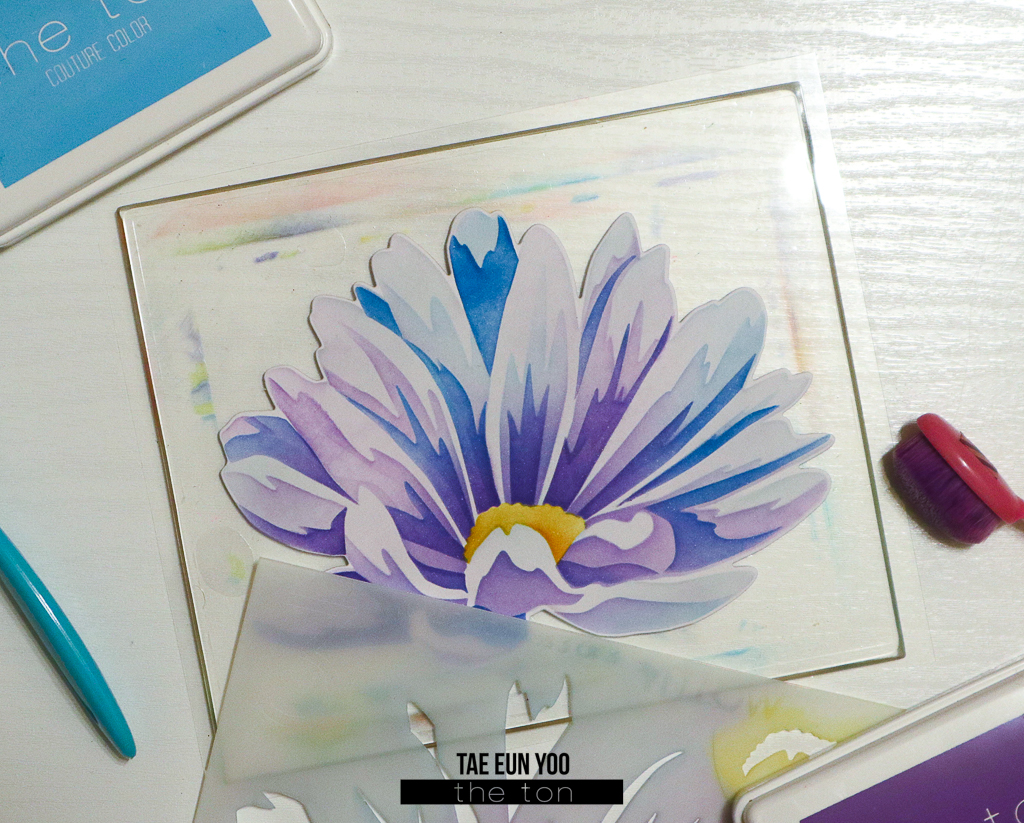 To make it easy to align, I first die cut the Jumbo Cosmos from some white cardstock using the coordinating die. Next I placed it on the Grip Mat and started stenciling. I chose to color the cosmos in two tones : blue and purple. So, I pulled out Cali Blue, Soft Amethyst, Iris Blooms, Azurite and Violet Fringe to stencil the three layers of the cosmos. The center of the flower was stenciled in yellow using Lemon Drop and Amber Citrine.