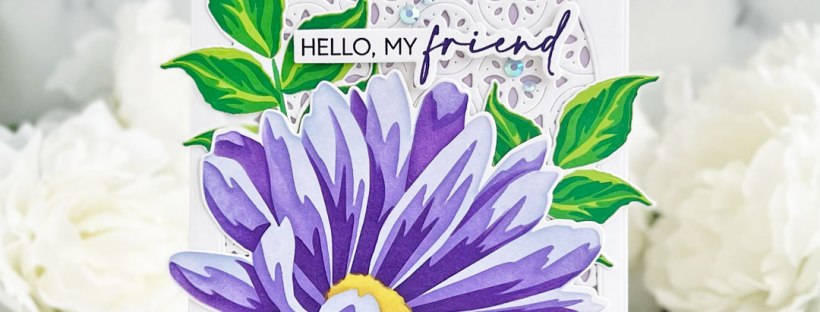 For the background, the Sand Dollar Coverplate Die was cut from white cardstock and adhered over a panel of pale purple cardstock. I die-cut a panel of white cardstock with the largest die in the Rectangle A2 Nested Die Set. The second largest die in the Dome Nested Die Set was die-cut from the center and it was adhered onto the front of the card. The flowers and leaves were arranged and adhered with liquid glue.