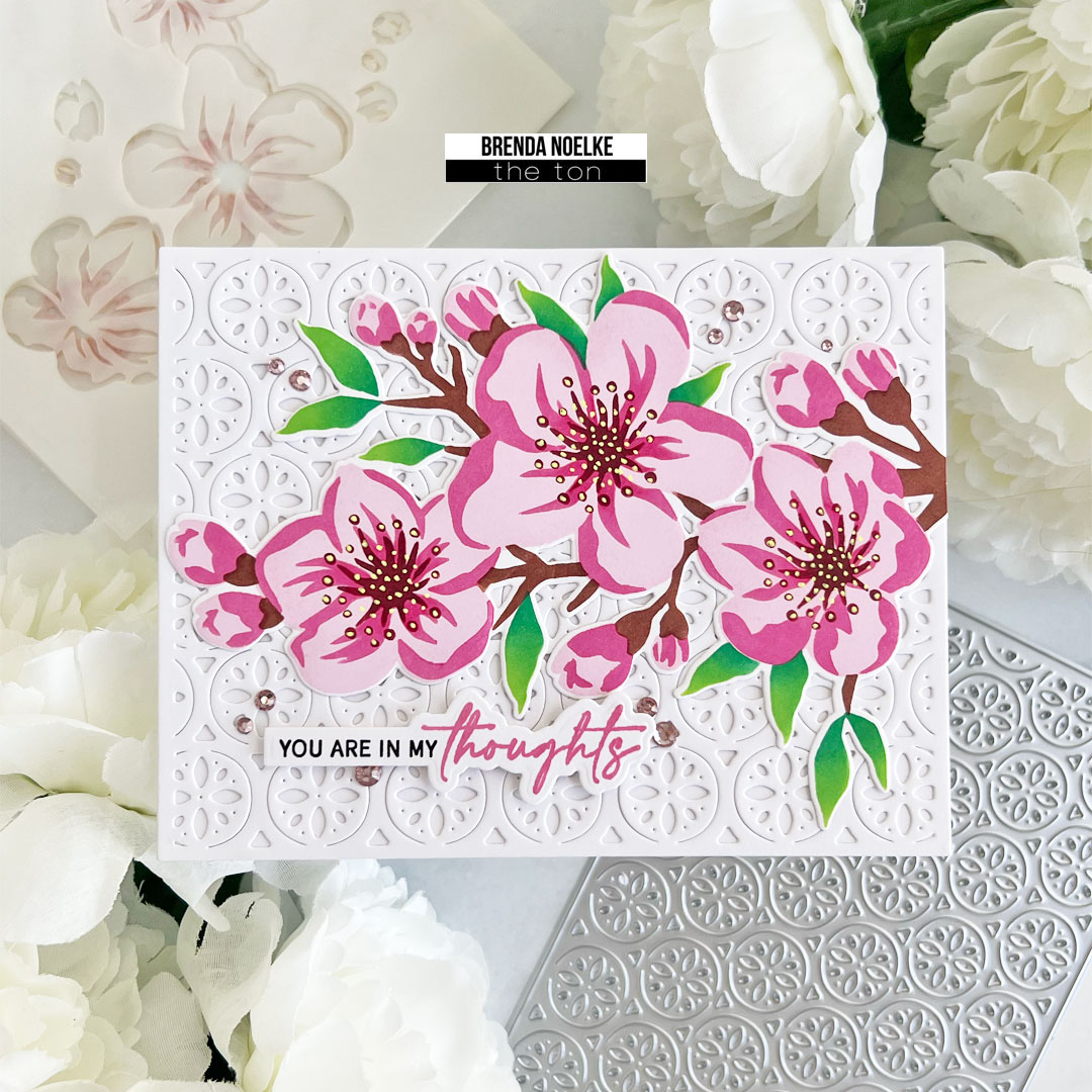 For the background, I die-cut the Sand Dollar Coverplate Die from white cardstock and layered it over a white A2 card base. (I can’t help it…a white-on-white background makes my heart happy!!) The stenciled cherry blossom die was adhered to the background and the excess was trimmed from the right side.