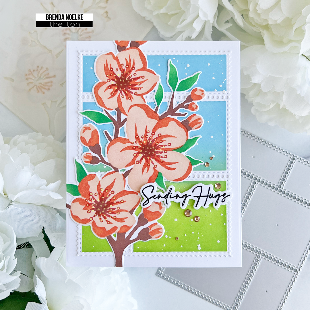I started by stenciling the Sweet Cherry Blossoms Stencil Set onto white cardstock with Peach Blossom, Coralline, Coral Cavern, Spiced Chai, Aspen Cocoa and Bright Fern inks. I added dots to the centers of the flowers with a yellow gel pen, then used the Coordinating Die to cut it out.