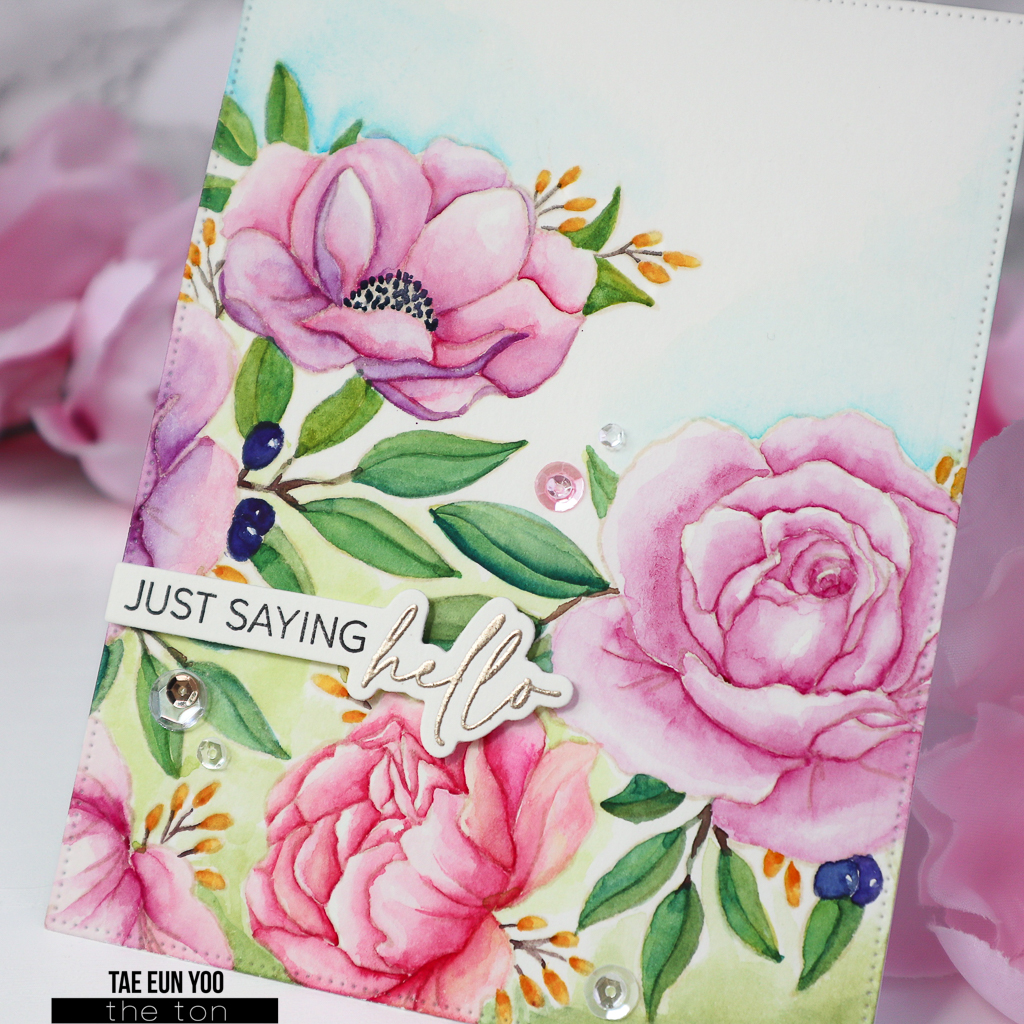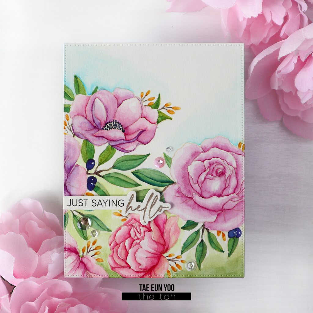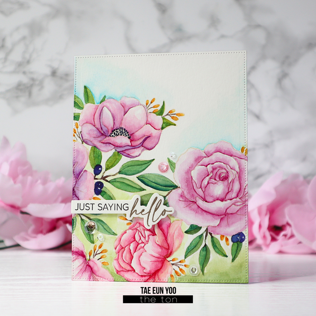 Hello everyone! Hope you’re having a great week so far! It’s TaeEun here today with a watercolored floral card. I did no line watercoloring of the beautiful outlined floral images from the Bonny Blooms set. This is a floral cluster image with three beautiful large flowers: a peony, a rose, and an anemone.