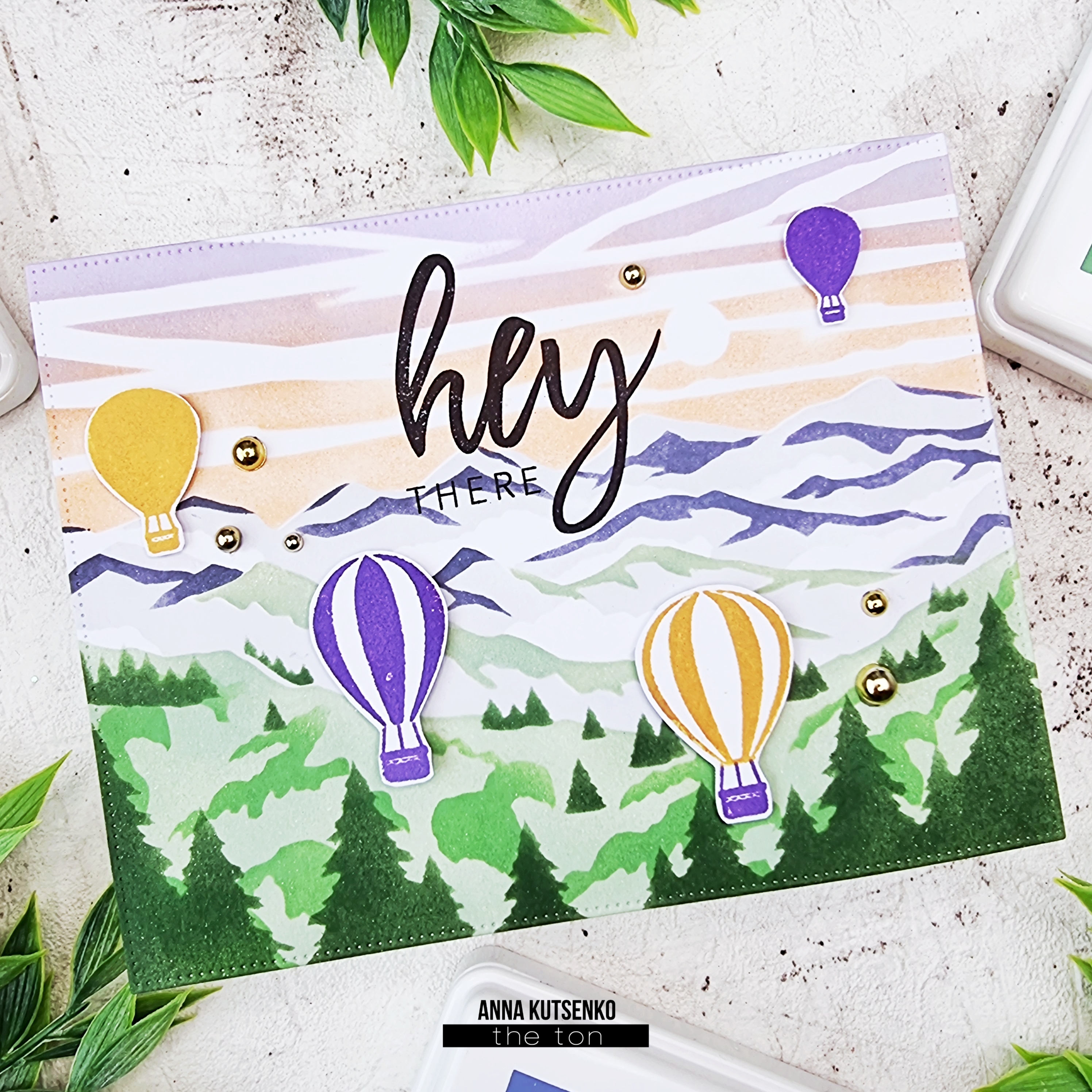 I started by stenciling the landscape image with Peach Blossom, Soft Amethyst, Vineyard, Soft Ash, Spring Salad, Stormy Sea and Everglade Moss inks. To make hot air balloons, I used stamps from Hey There Sentiments stamp set and Amber Citrine and Iris Blooms inks.