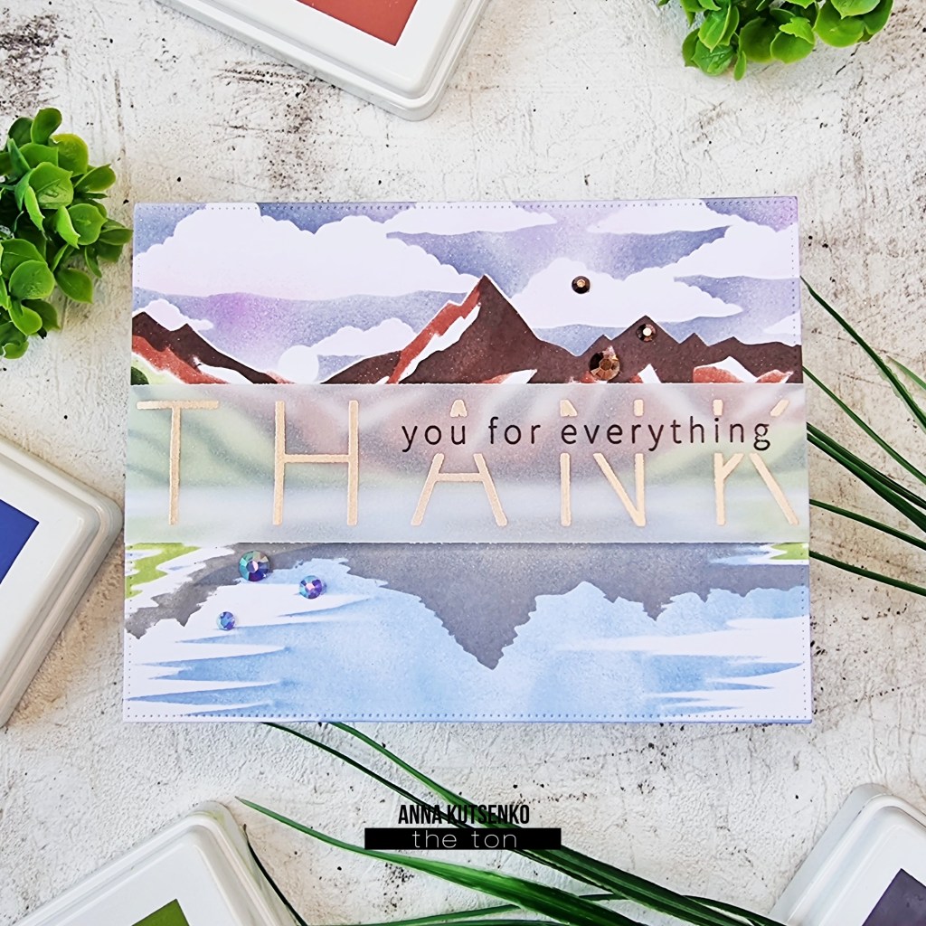I started by stenciling the mountain lake image using Soft Amethyst and Stormy Sea (sky), Spiced Chai and Dark Roast (mountains), Matcha and Everglade Moss (forest), Periwinkle and Smoky Quartz (lake), Soft Orchid (clouds) inks. I stamped “THANK” from Fill It In Sentiments on the stripe of the vellum and heat enbossed it in Rose Gold. “You for everything” were stamped in Noir.