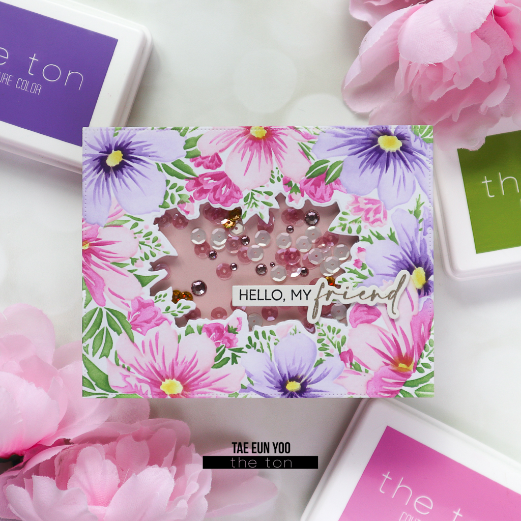 I cut out the central part of the panel using the Floral Border die, which coordinates with the Cosmos Border stamp and Cosmos Border Layering Stencils. Next, I cut the panel using the largest die from the Double Pierced Rectangle A2 Nested die set. I cut some white fun foam twice using the same dies and trimmed the perimeter of the fun foam to make it slightly smaller than the front panel. I stacked them together to make the shaker wall. Next I adhered a piece of clear acetate sheet on the back of the front panel and added it to the fun foam.