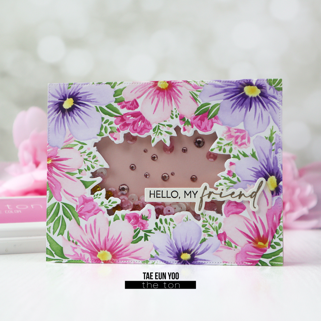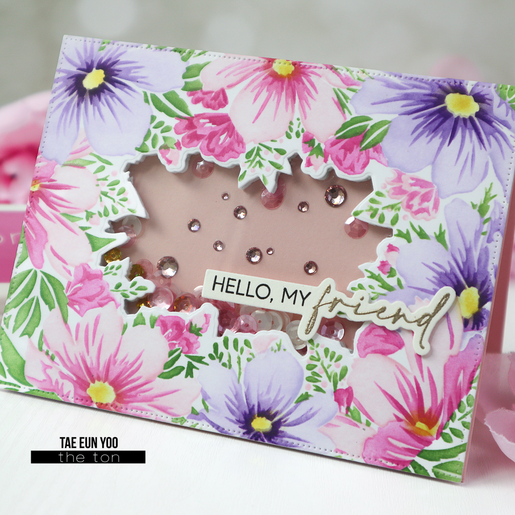 The last card for today shows the Cosmos Border Layering Stencils. I made a shaker card using the stencils and the Floral Border die.