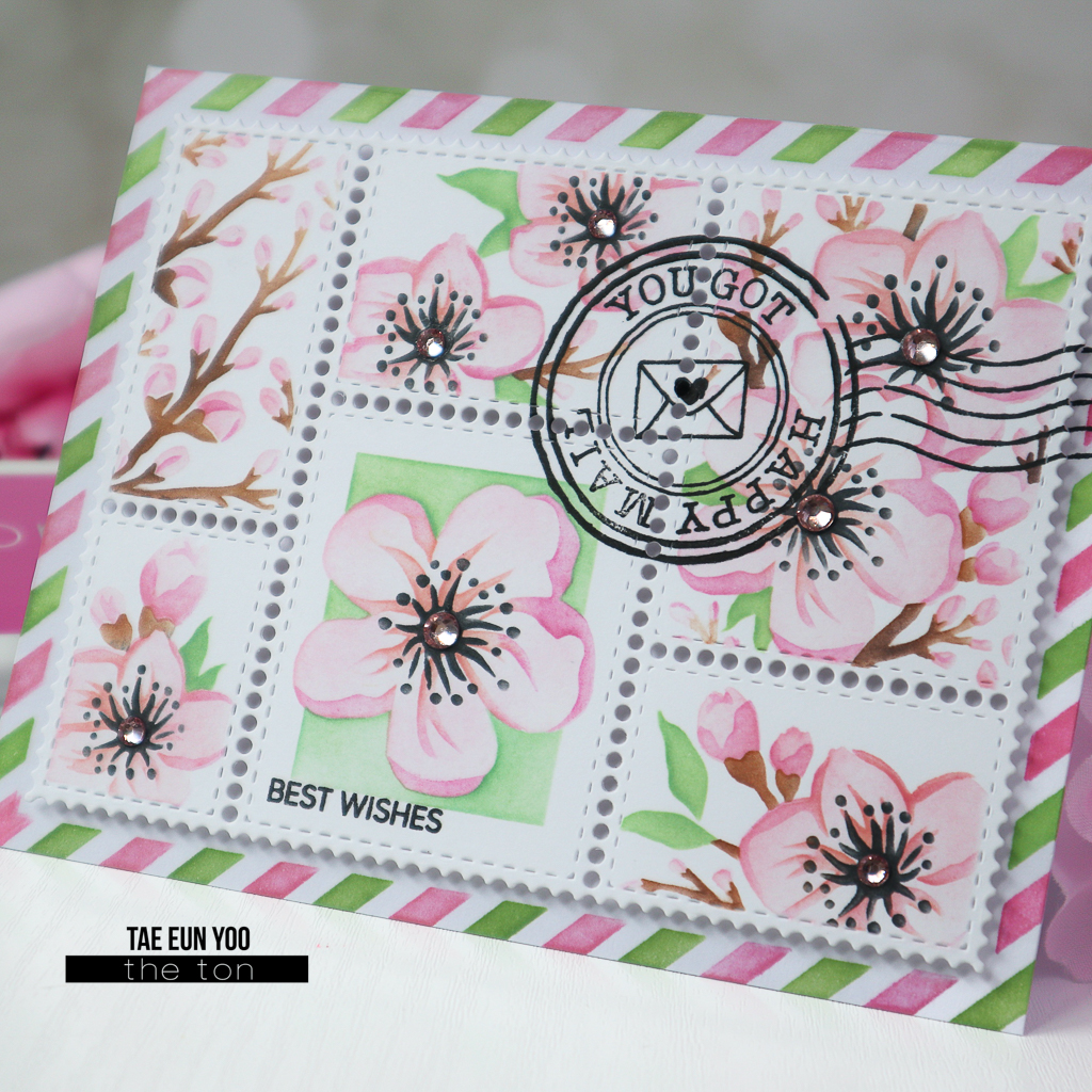 Let’s start with the card that features Postage: Cherry blossoms Layering Stencils.