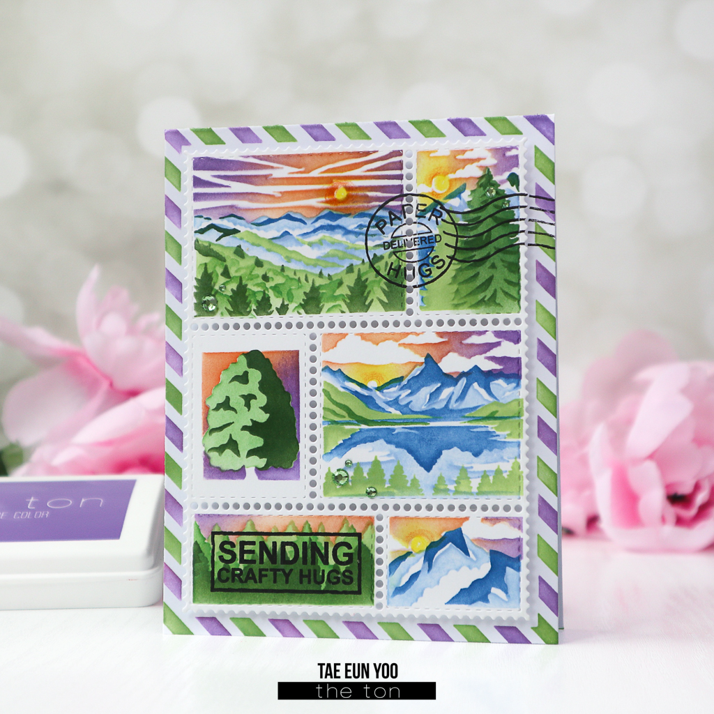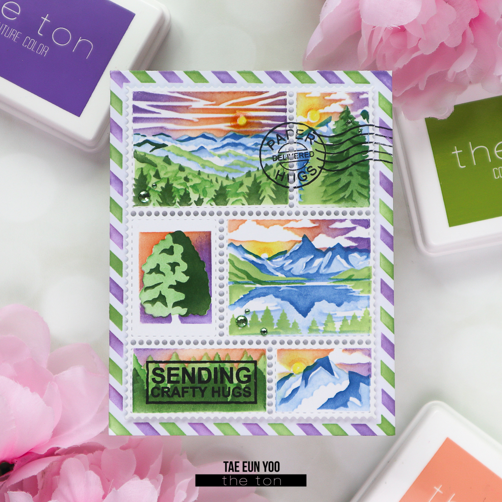 The next Postage card showcases the Postage: Mountains Layering stencils.