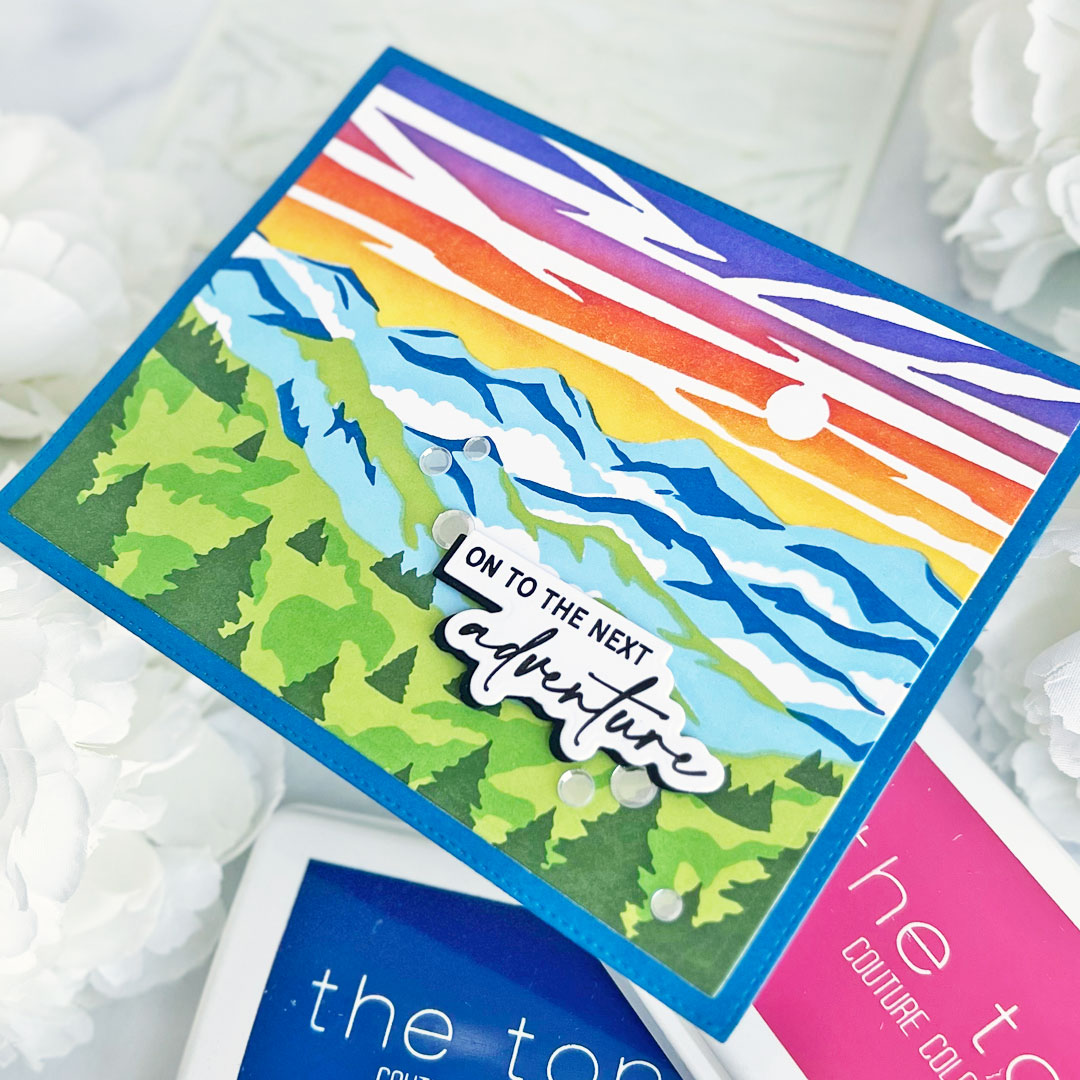 I started by blending the Mountainscape Layering Stencil Set onto white cardstock with bright colors of The Ton’s dye inks. I used Lemon Drop, Coralline, Deep Peony and Violet Fringe inks to create a sunset sky. Meadow, Evergreen and Everglade Moss inks were used for the ground and trees and the mountains were blended with Cali Blue and Deep Sapphire inks.
