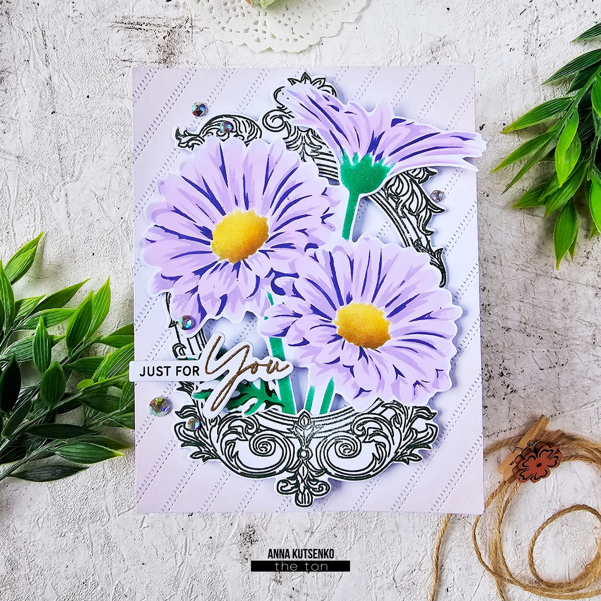 Created by Anna using our Daisy Bouquet stencils, Baroque Frame Oval stamp set and dies, Holiday Border Dies, Easy Expressions Birthday stamp set and coordinating die. Inks: Amethyst and Garden Collection