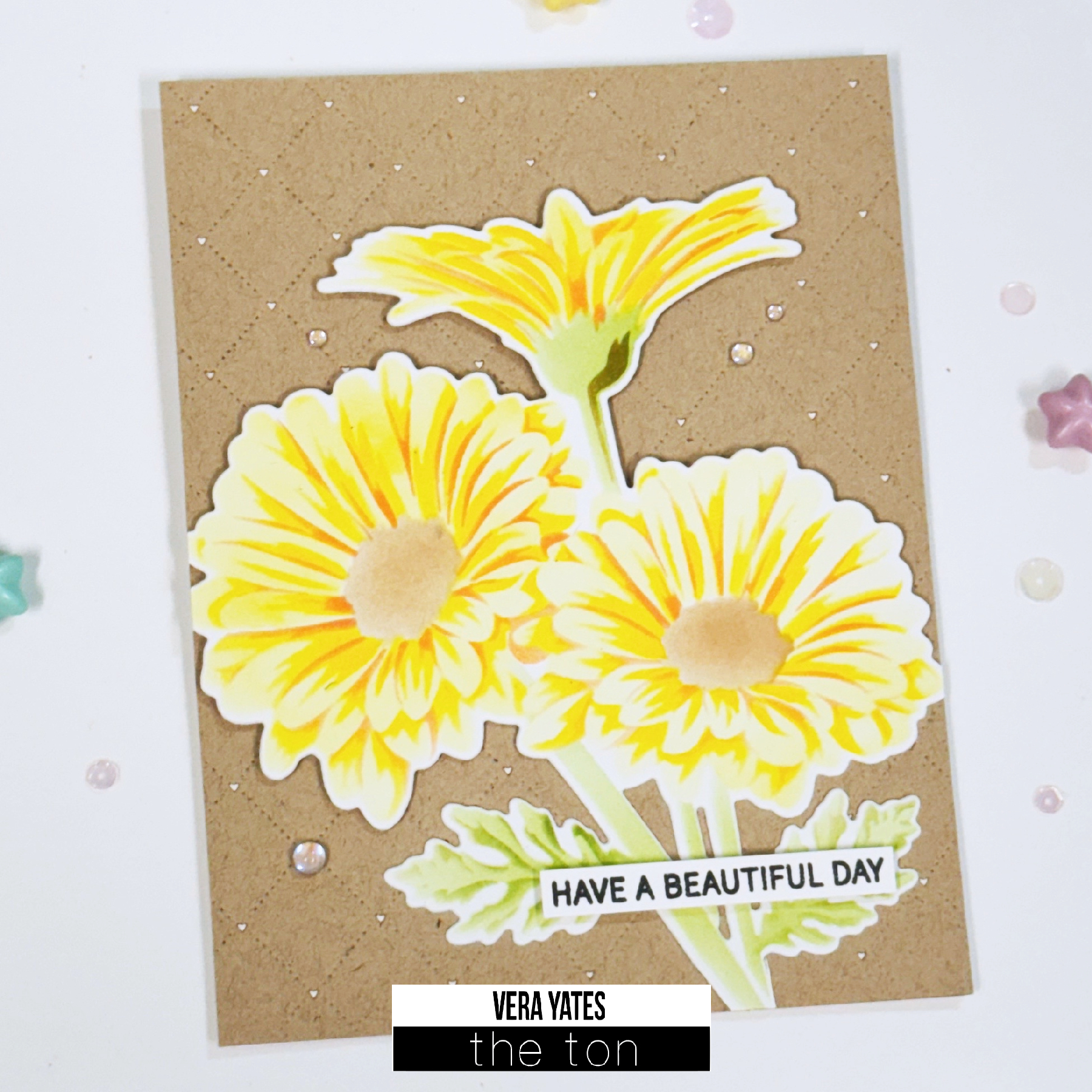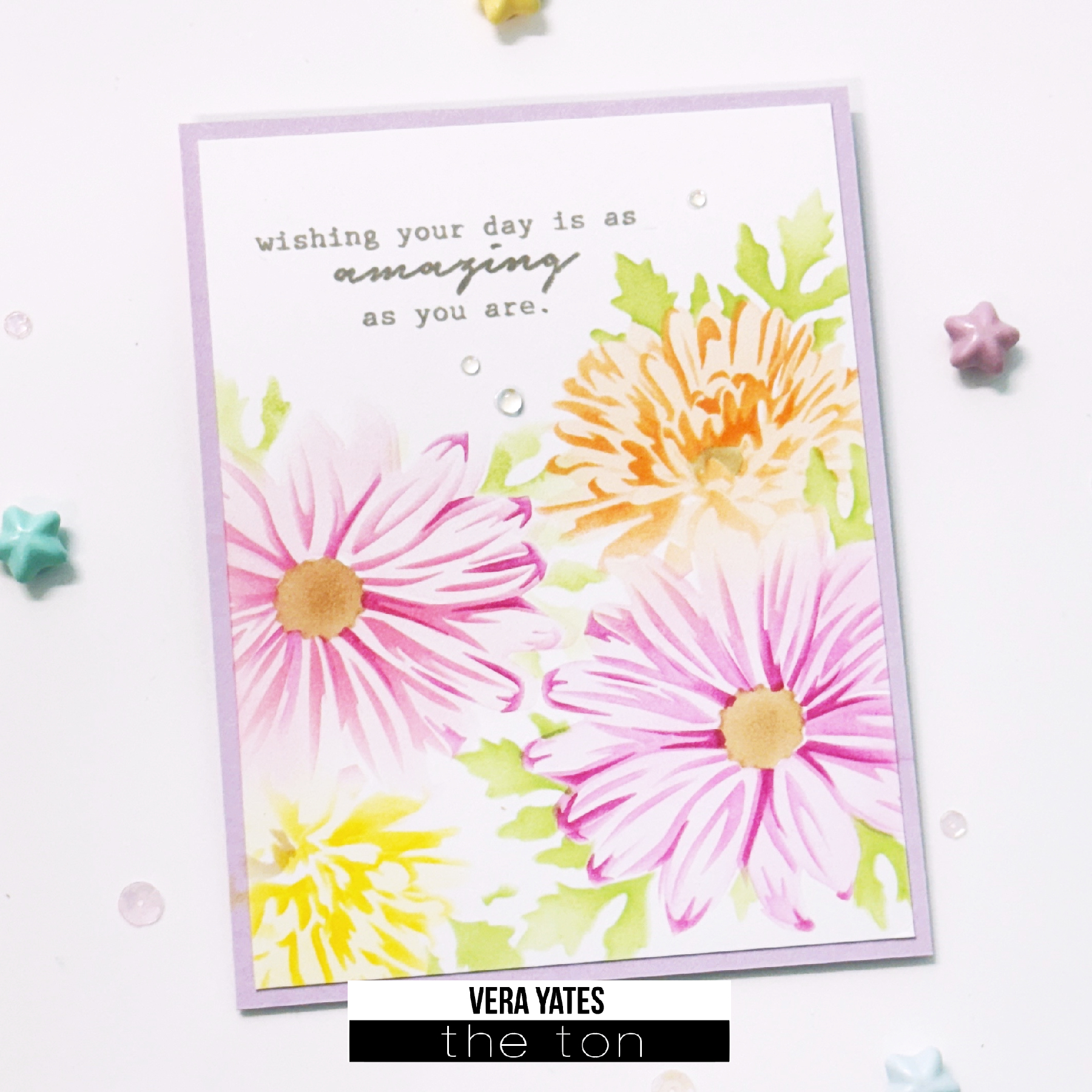 Created by Vera using our Daisy Bouquet stencils, Quilted A2 coverplate die. Inks: Citrine Collection and Matcha and Spring Salad