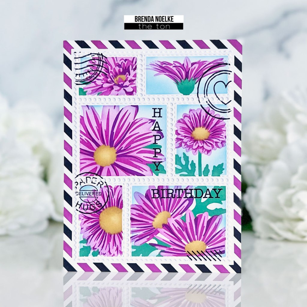 Created by Brenda using Postage Daisies Stencils, Postage Party Dies, Postage: Windows Stencil, Postage: Stripes Stencil, Not A Bill Stamps, Postage Sentiments Stamps