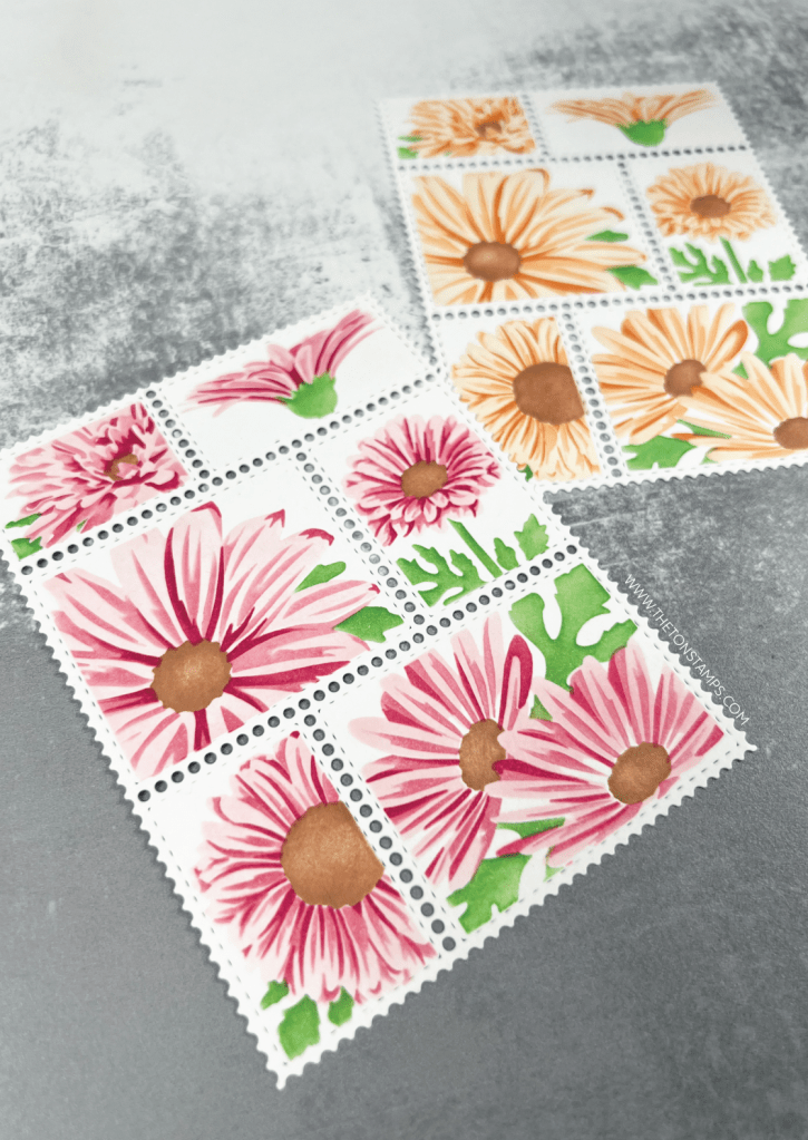 First up is our new Postage: Daisies stencils. This set comes with four stencils and coordinates with our Postage Party die. Each stencil measures approximate 4.4 x 5.5 inches.