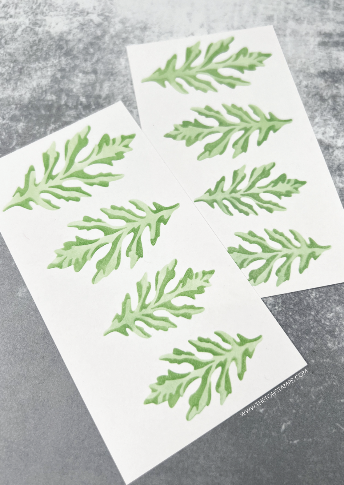 - Then rotate the stencil 180º and line up the upper left corner once more. Then blend with a darker green. Die cut with the coordinating die.