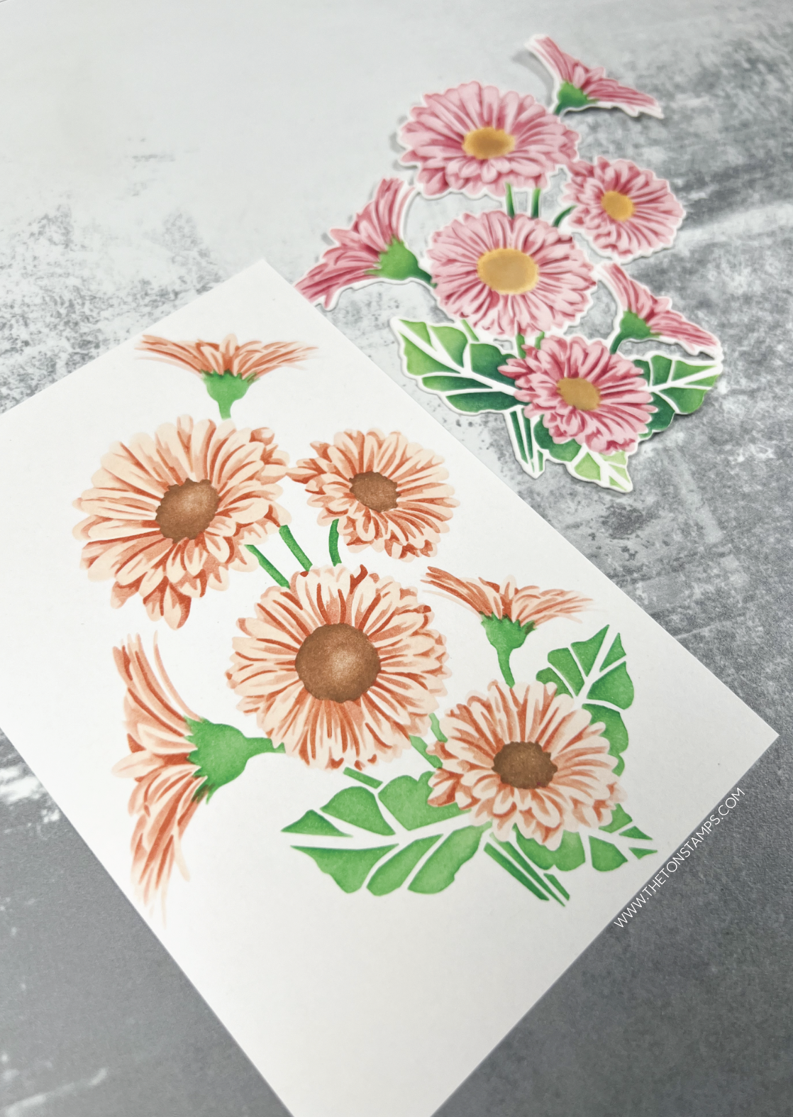 Created by Vera using our Daisy Duo stencils. Inks: Citrine, Coral and Orchid collections.