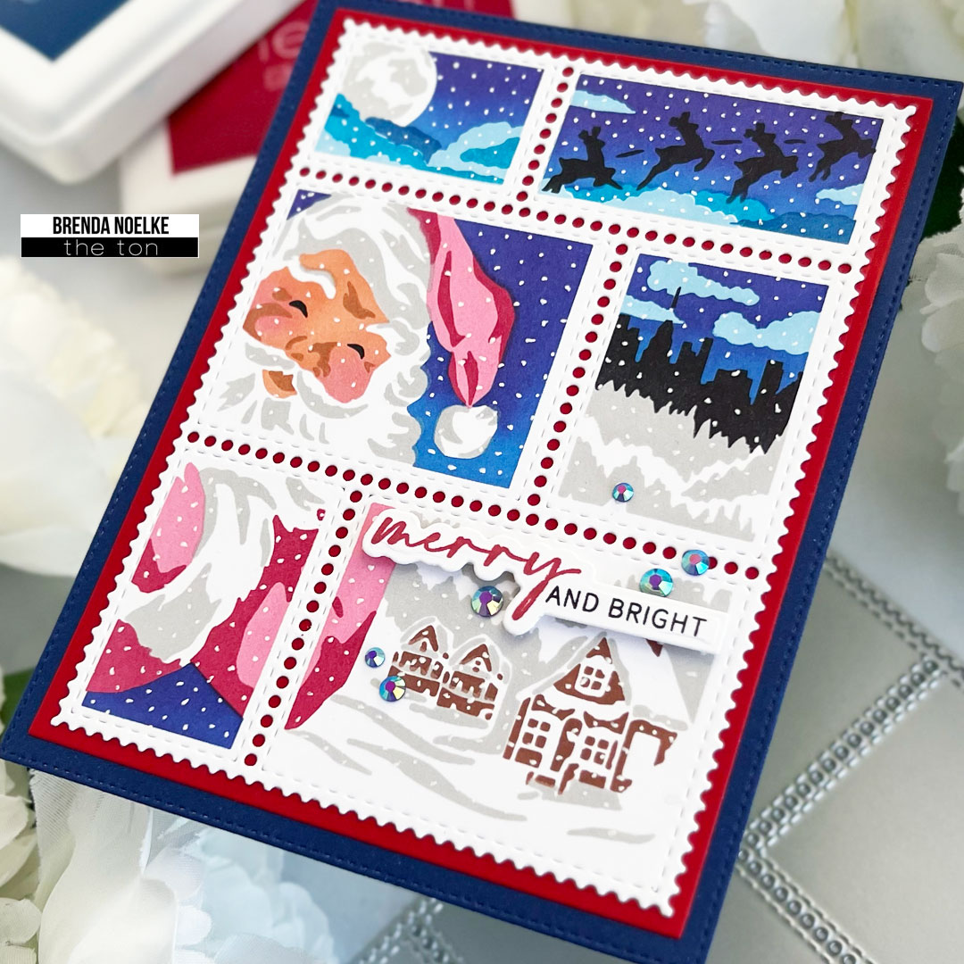 I began by die-cutting the Postage Party Die from white cardstock. The Postage Santa Layering Stencils were stenciled onto the panel, following instructions in the package. I used the following inks:
