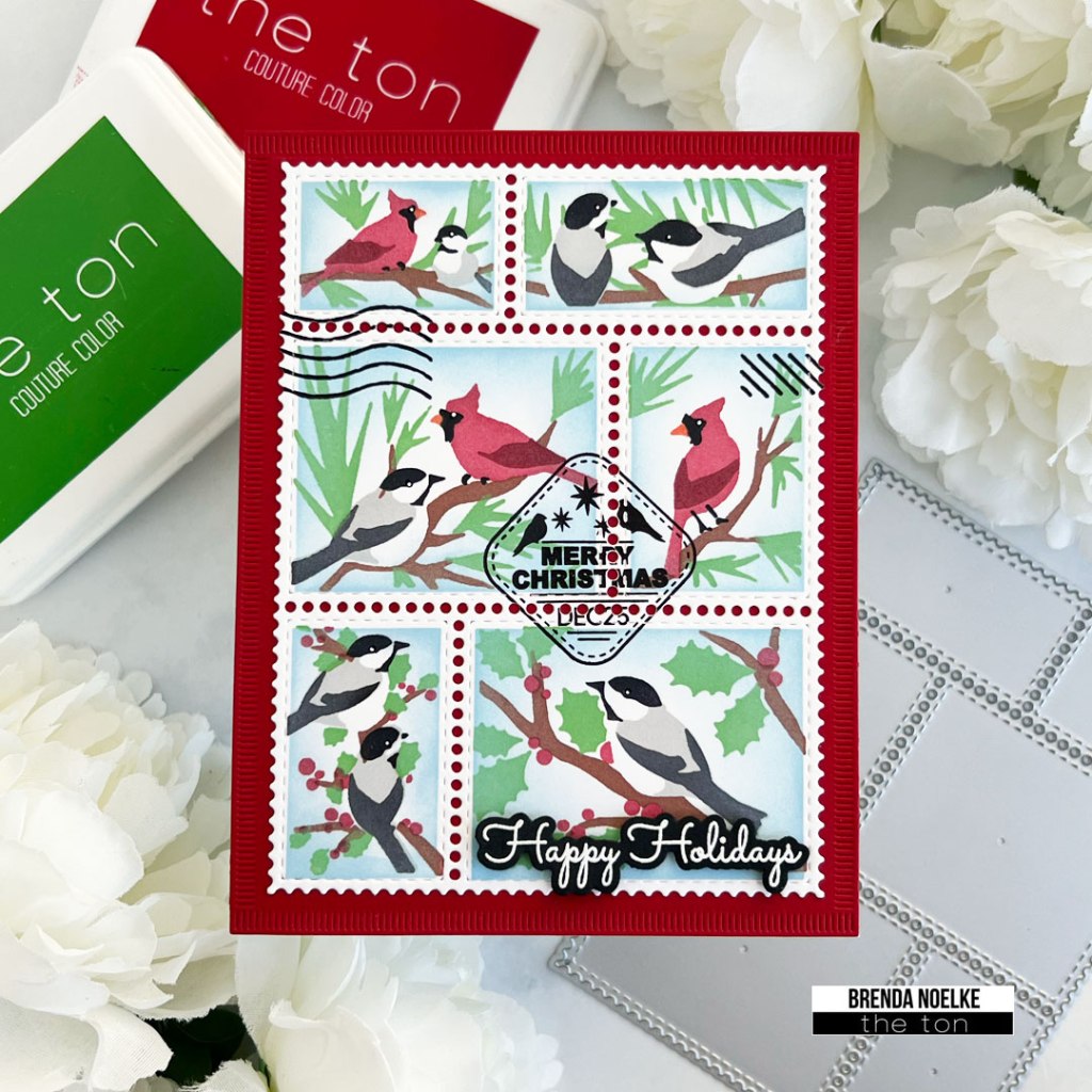 I started by die-cutting the Postage Party Die from white cardstock. I stenciled the Postage: Winter Birds Layering Stencils onto the die-cut using Valentine Red, Crystal Pewter, Wine, Light Onyx, Noir, Coralline, Aspen Cocoa and Evergreen inks. I placed the Postage: Windows Stencil over the die-cut and lightly blended Cali Blue ink along the inner edges of each section.