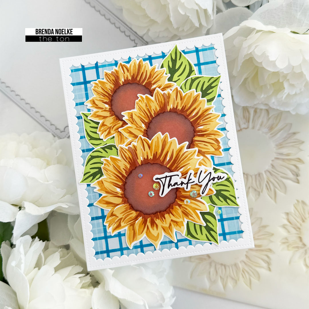 For the background, I used the Tri Plaid Layering Stencils. It was stenciled onto a panel of light blue cardstock using Cali Blue, Parisian Blue and Hampton White Pigment inks. The largest die in the Inner Scallop Nested Die Set was die-cut from white cardstock and adhered to the plaid background with liquid glue. The sunflowers and leaves were arranged and adhered, also using liquid glue.