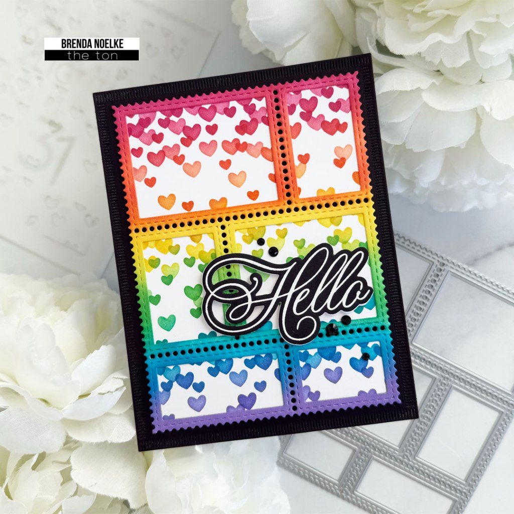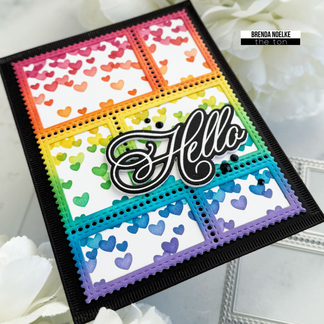 Hello, fellow crafters and cardmakers!! I hope your week is going well!! Brenda here with a colorful “hello” card to share with you today!! I love the combination of rainbow colors with black and white!! It makes my heart happy!!