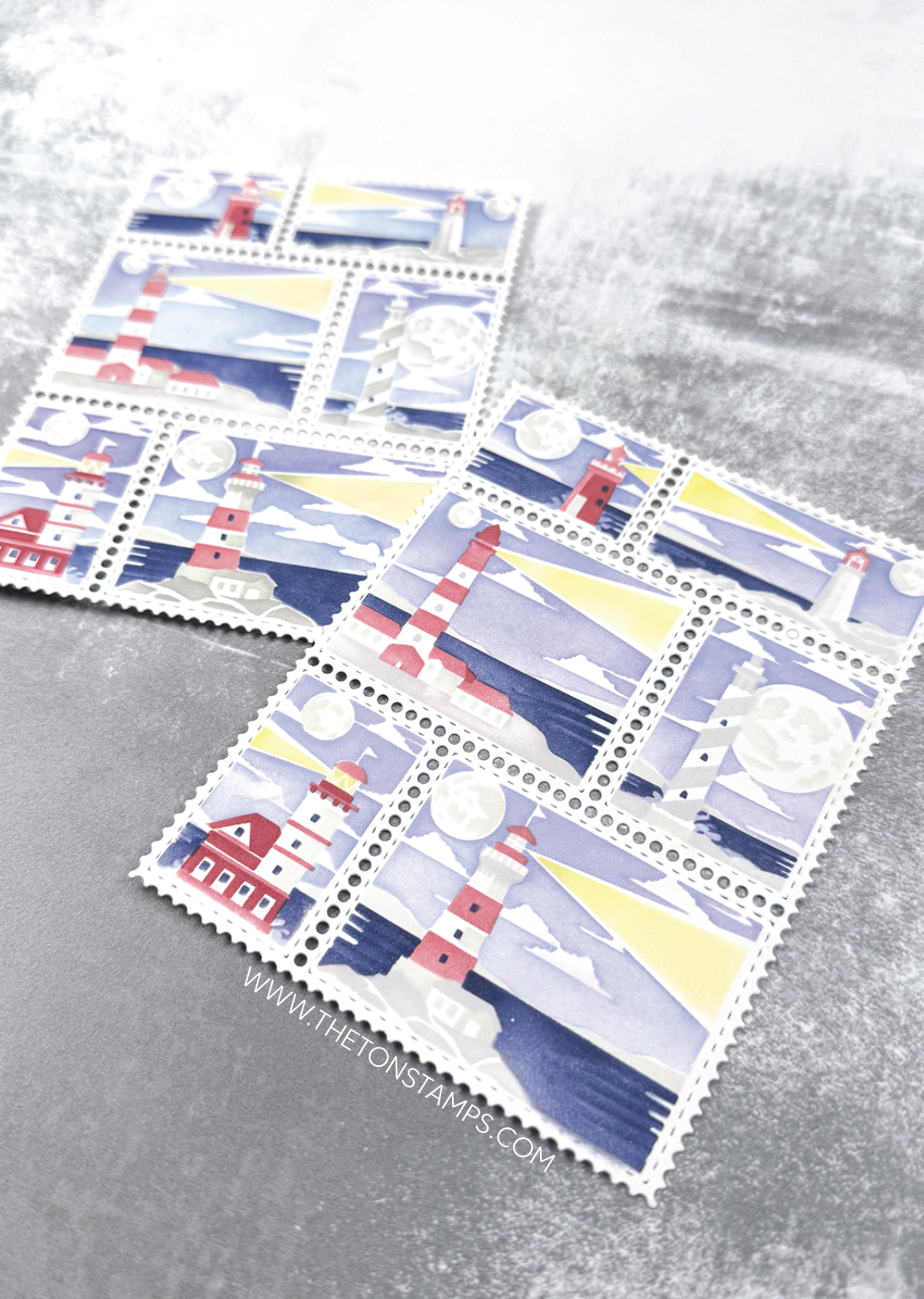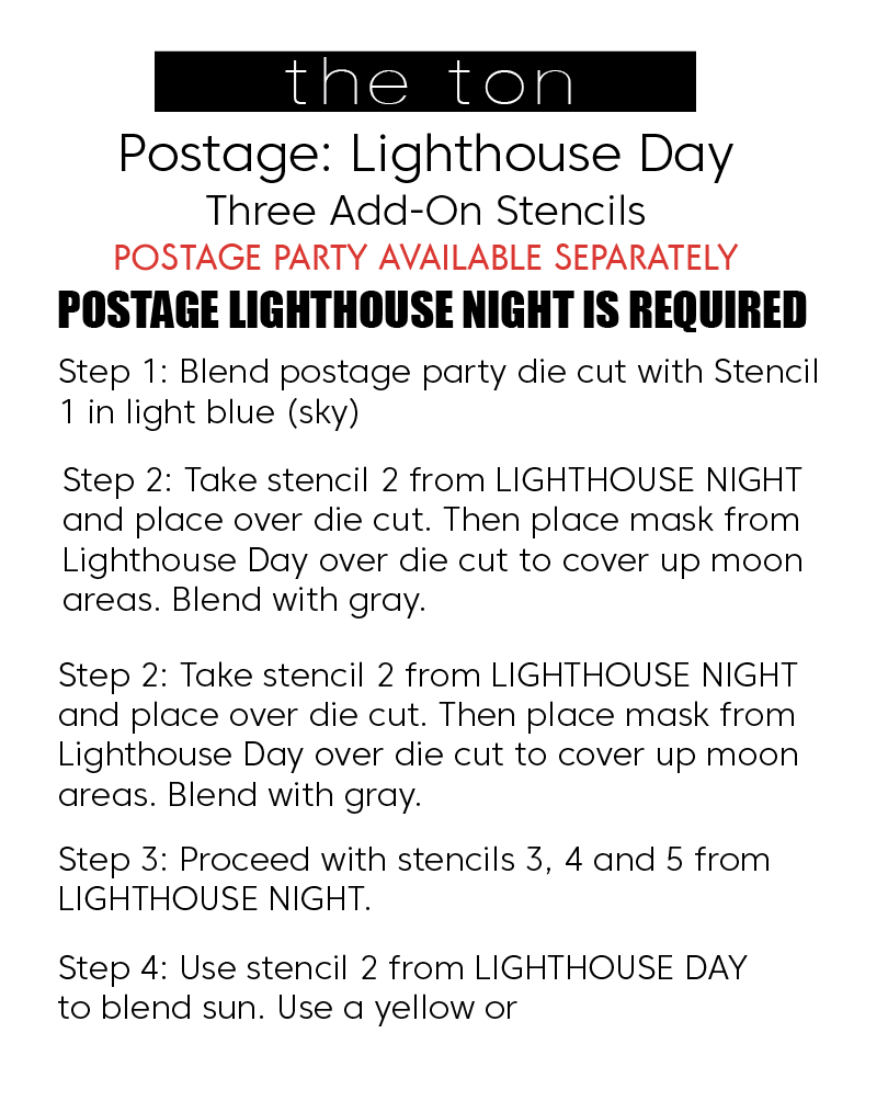 This set is comprised of five stencils where you can blend night time lighthouse scenes inside the panels of our Postage Party die cut.
