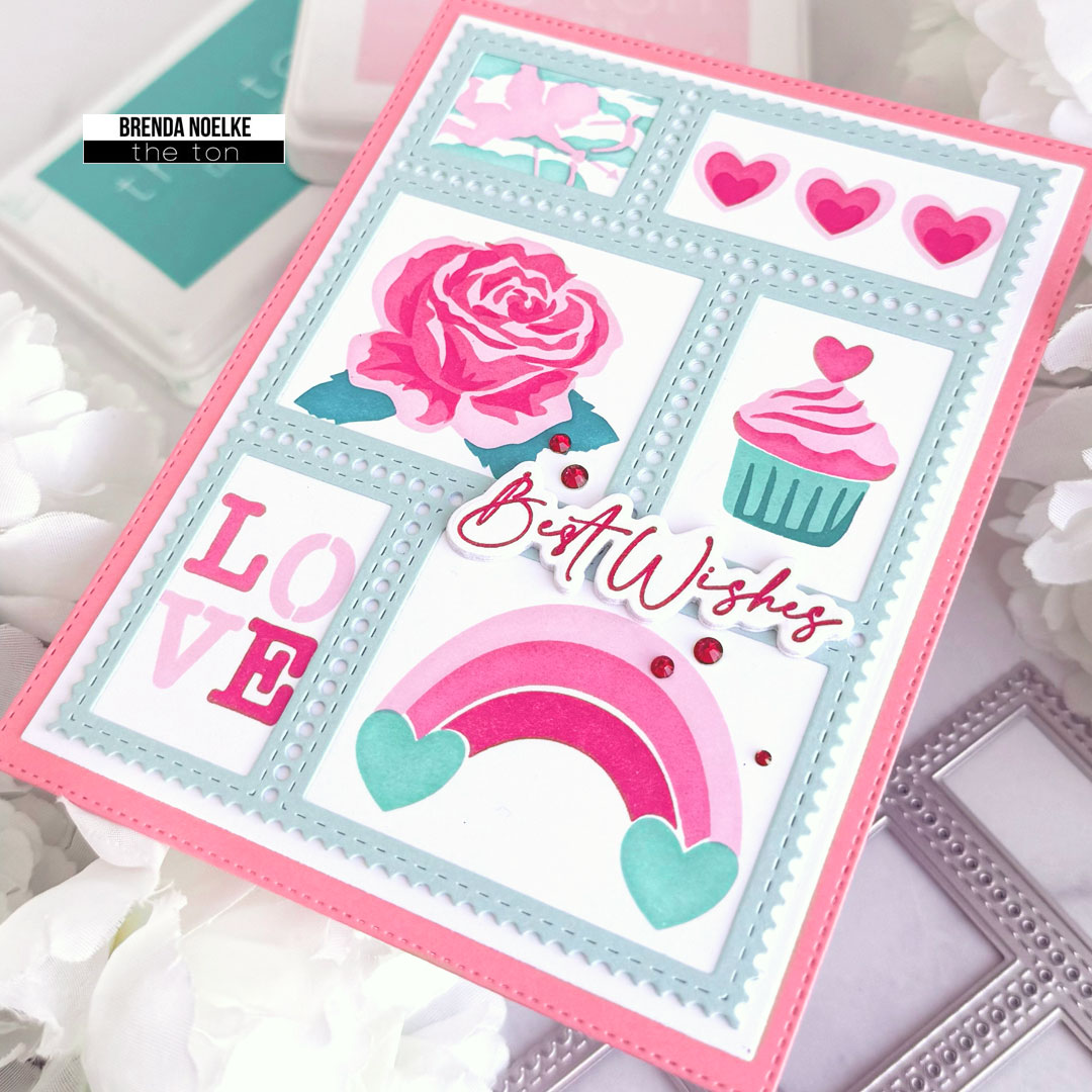 I started by die-cutting the Postage Party Die from white cardstock. I stenciled the Postage: Love Layering Stencils onto it using Rose Quartz, Hollywood Star, Cosmopolitan Pink, Caribbean Turquoise and Hot Tourmaline inks.