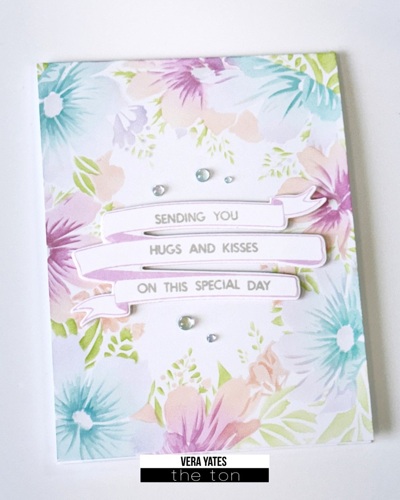 Then, I stamped the banner and sentiment from Basic Banners. This specific set already been discontinued, but you can use any banner set you have. Finish by adding some enamel drops.