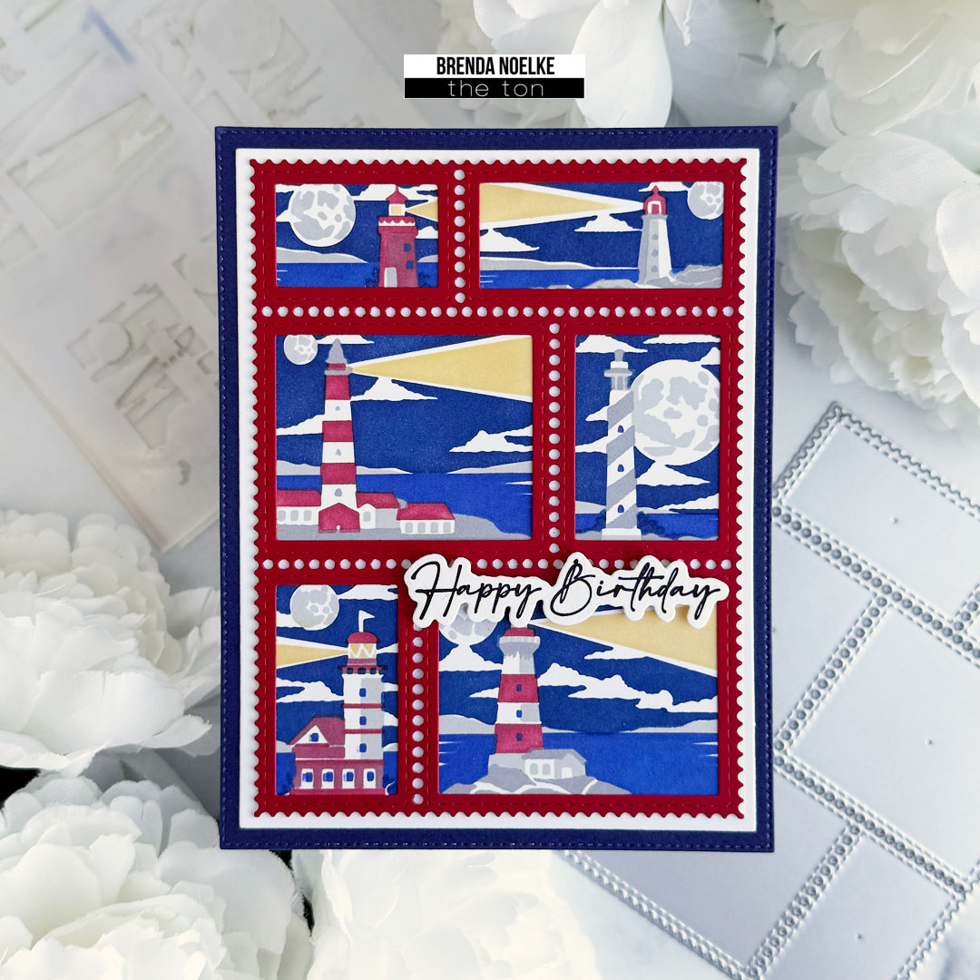 Happy Monday, crafters!! Brenda here with a pair of postage lighthouse cards featuring the Postage: Lighthouse Day Add-On and Postage: Lighthouse Night Stencil Sets!!
