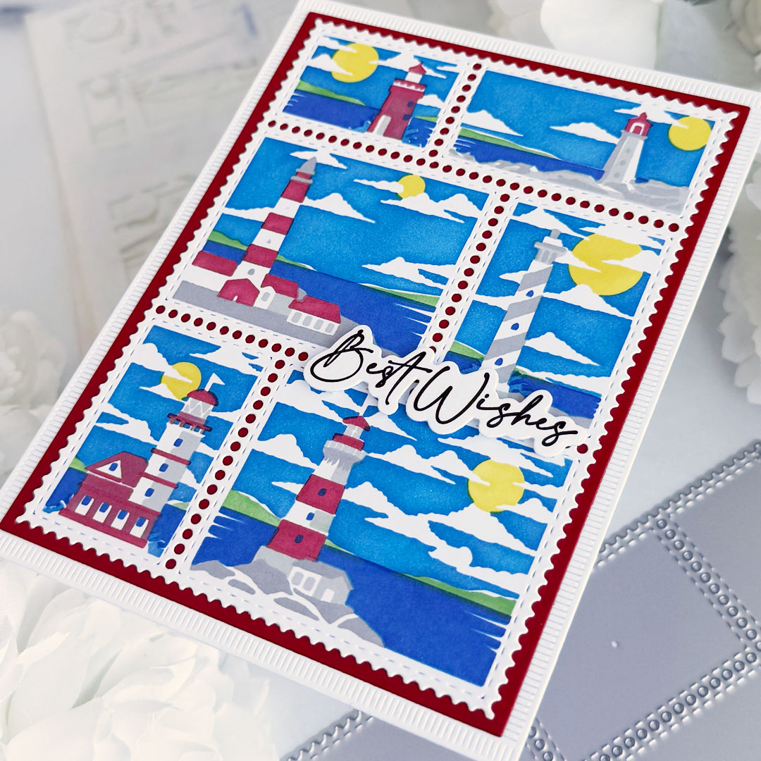 The day scene was create much the same way, by die-cutting the Postage Party Die from white cardstock and stenciling the Postage: Lighthouse Day Add-On Stencil Set, along with the Postage: Lighthouse Night Set, onto it. I used Parisian Blue, Lemon Drop, Crystal Pewter, Spring Salad, Valentine Red, Smoky Quartz, and Violet Fringe for this one.