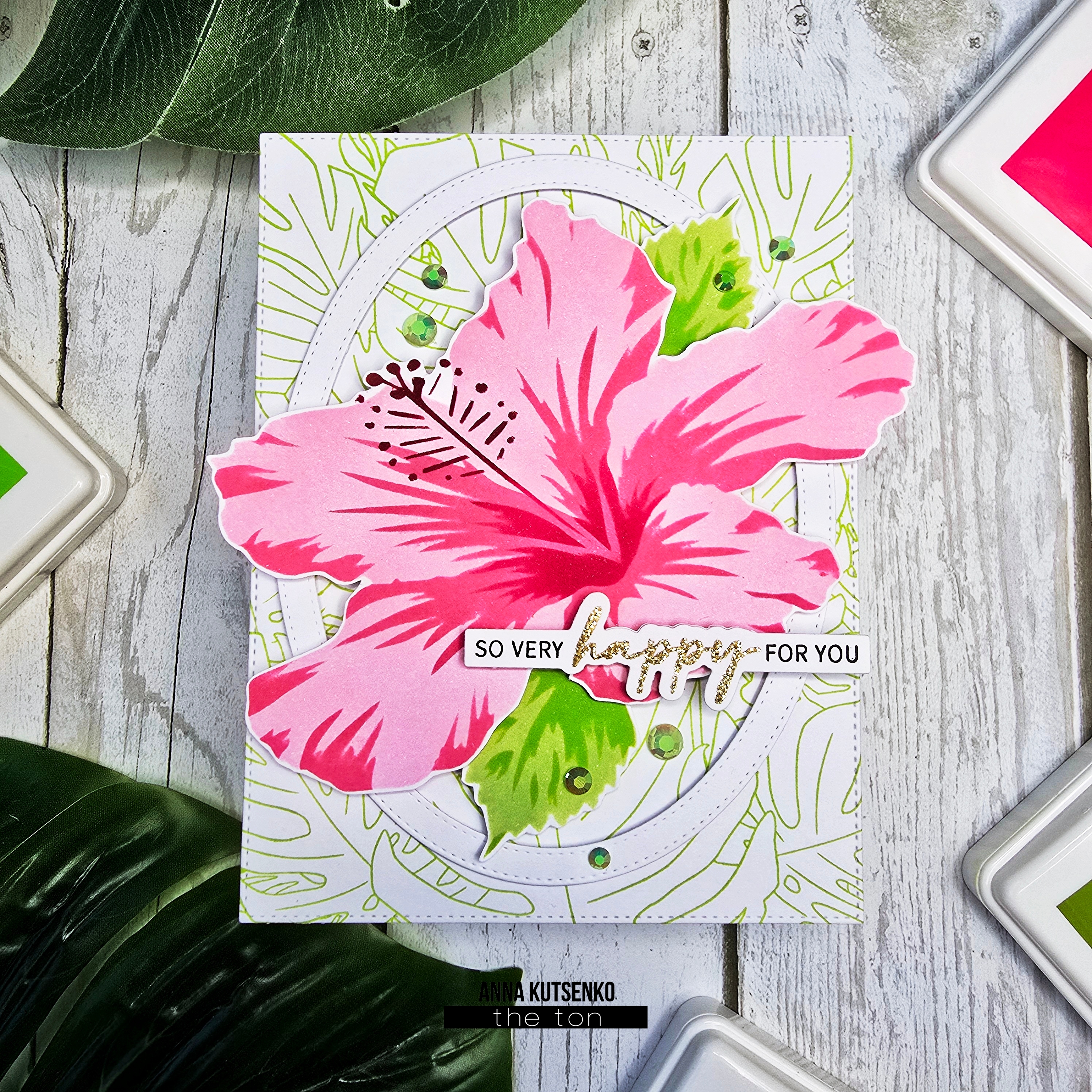 I started by stenciling the hibiscus flower with Bubblegum, Hollywood Star and Red Sangria inks. The leaves were colored in Matcha and Soft Garden. Next, I fussy cut all images, but you can use Mid Hibiscus Coordinating die. For the background, I stamped Many Monsteras stamp onto A2 sized white cardstock card base in Soft Garden. To make the white cardstock frame, I used Double Stitched Oval Coverplate Die.