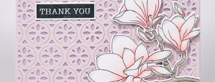 To start I die cut the background using Sand Dollar Coverplate Die. I think the result is simply gorgeous, that I actually almost use it just as is. But, since I have my heart set to use the magnolias, I went ahead and stamped, colored and die cut the image from Magnificent Magnolias set.