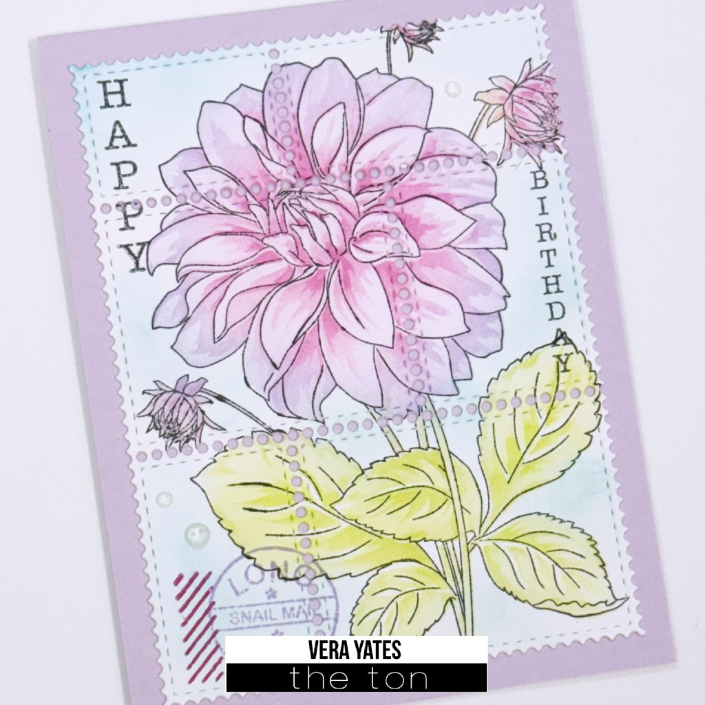 To start, I die cut the postage background and then stamped the dahlia image on it using Caviar ink. Then using the layering stencil colored the flower with Dolled Up, Grand Fuchsia, Iris Blooms and Soft Garden. Adhere the postage panel to card base. Then, I stamped some more details from Not A Bill set and for the sentiment I used sentiment from Postage Sentiments set. Finished by adding some mix size Diamond gem rhinestones.