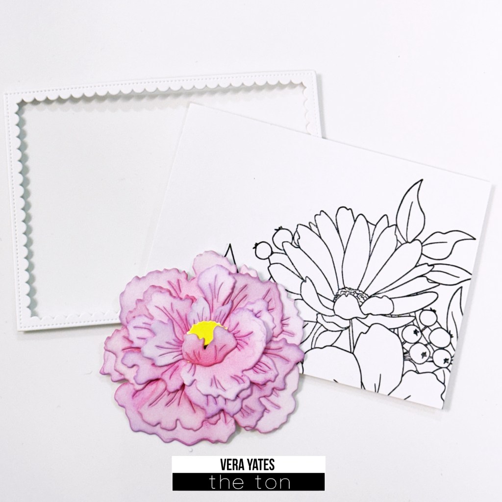 First, I die cut the scallop frame using Inner Scallop Nested die. I love the dainty design of this scallop. Next, I cut a panel about the same size as the scallop frame. Next, I stamped the image from Heartfelt Blossoms at an angle. Put aside and die cut the Peonies from white cardstock and then colored all the pieces by ink blending Deep Peony, Bubblegum for the flower and Spring Salad for the leaves.