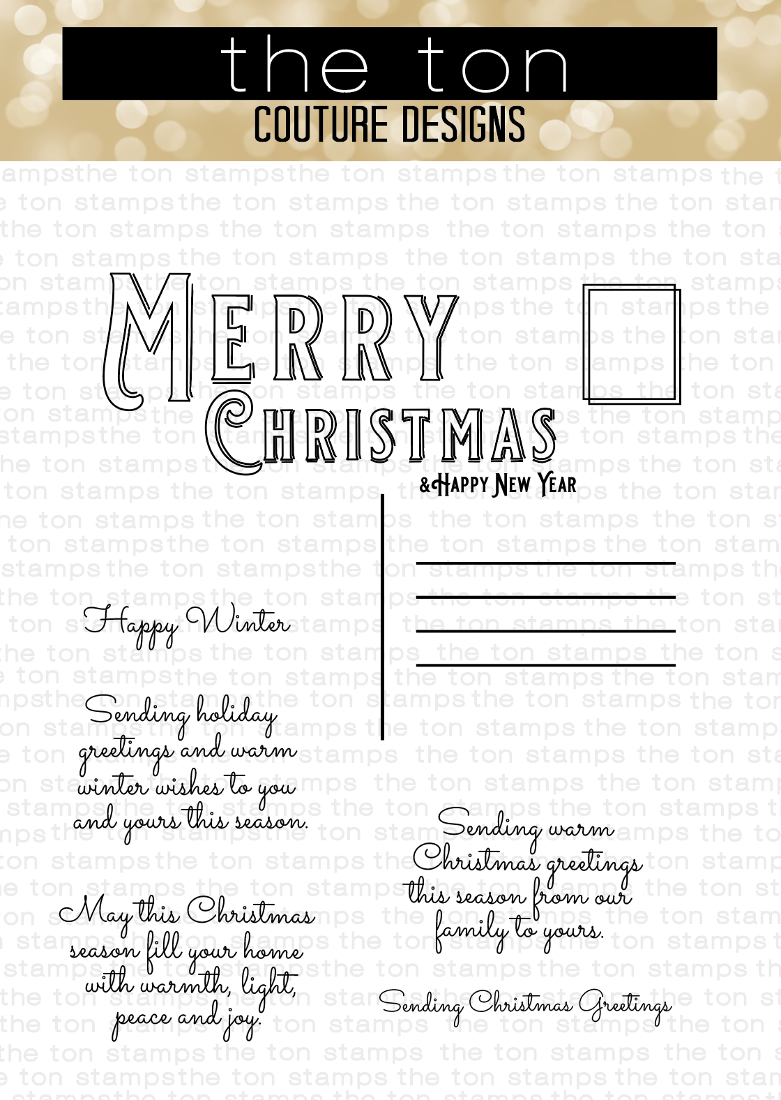 Next up is our Postcard Christmas stamp. This is a 4×6 inch photopolymer set which includes 6 stamps to create your own postcard themed greeting card.