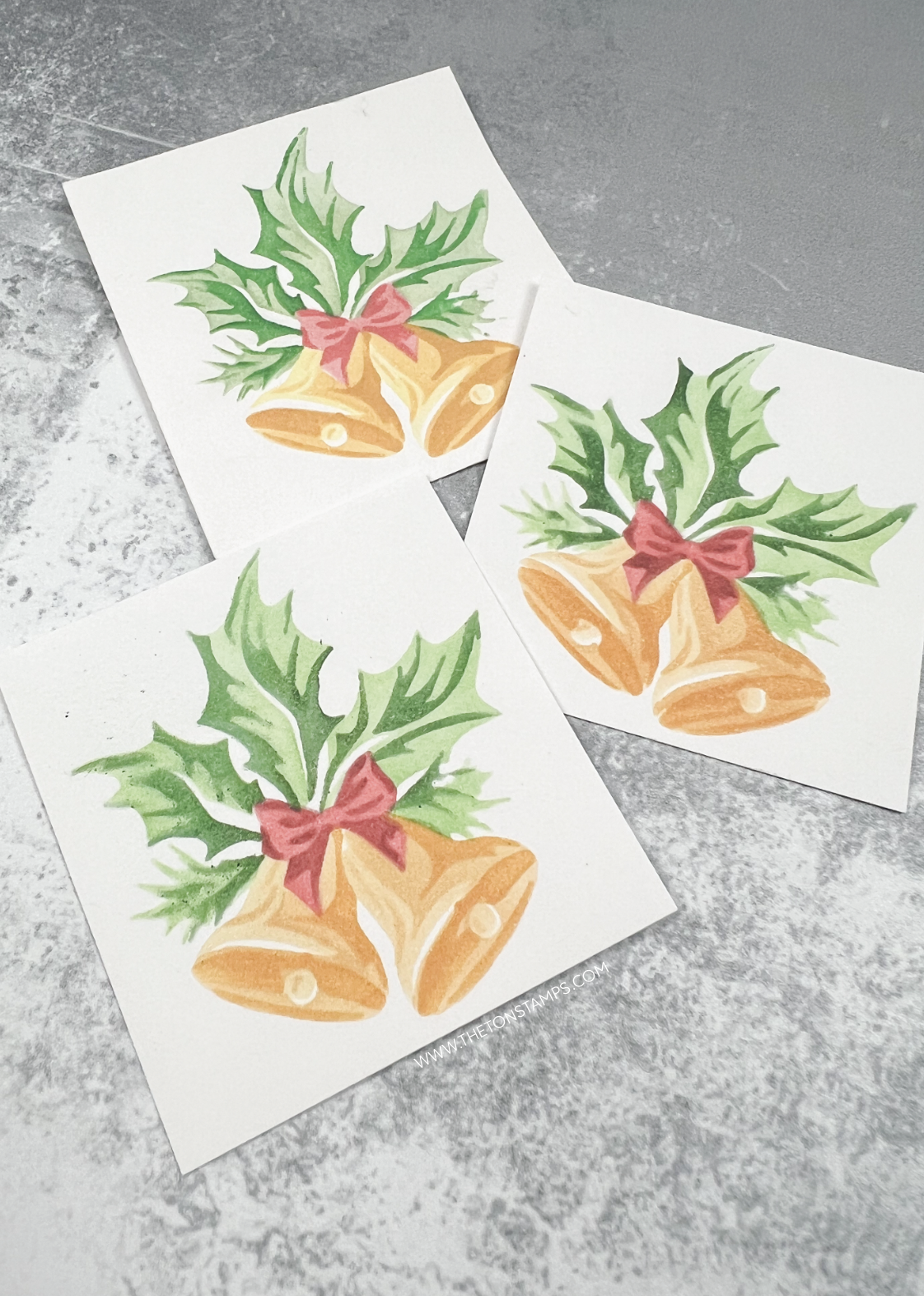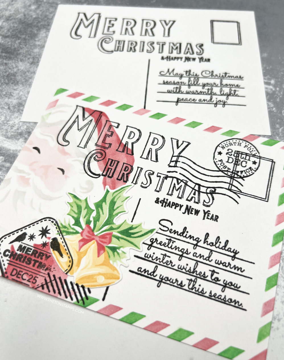 Created by Effie using Postcard Christmas stamp, Postage Seals stamp, Mini Bells stencils and Peeking Santa Stencils. Inks: cherry, evergreen, citrine collection, soft ash, whisper pink