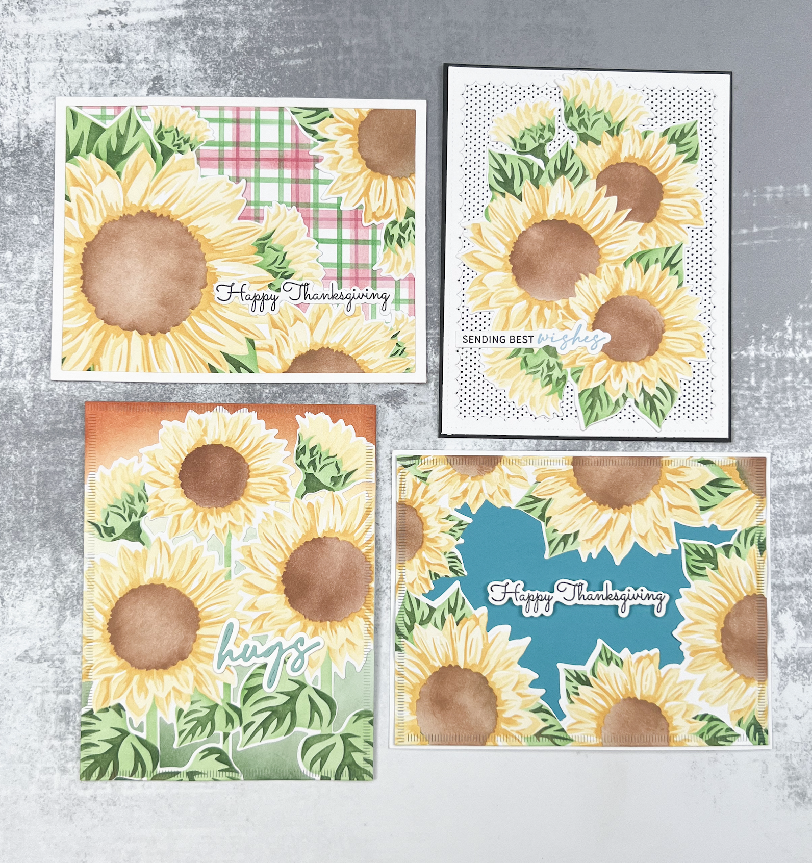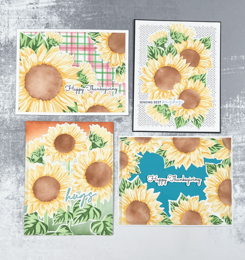 First up is our Sunflower Party Large Stencils. There are 5 layers total, three layers for the petals and 2 layers for the foliage. Each stencil measure 9.5 x 12 inches to help you create four beautiful A2 cards at once. The coordinating dies is a collection of 4 dies that will cut out the four different panels.