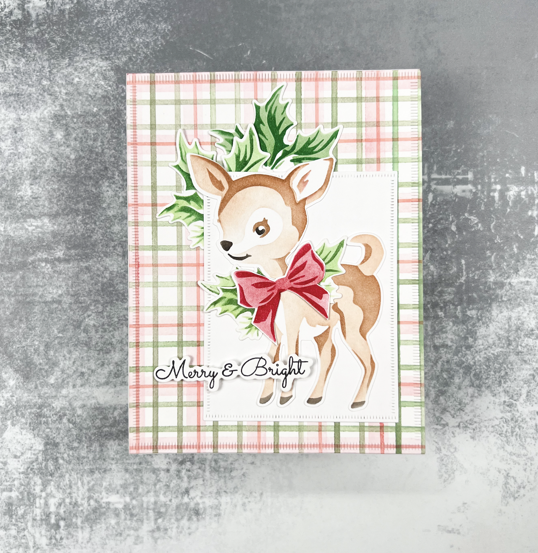 Created by Effie using our Vintage Deer stencils, Mini Bell stencils and die, GWP Ribbon stencils, Script Holiday Notes stamp and die, Striped Edge Nested Dies