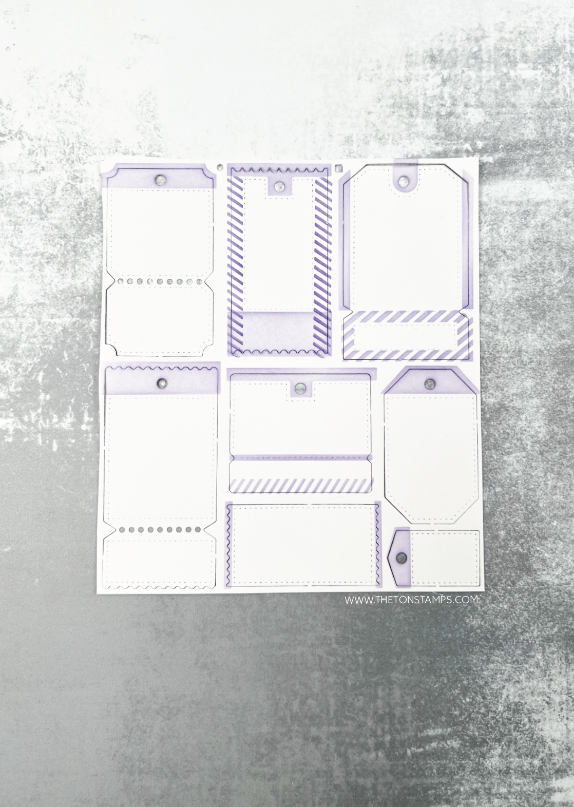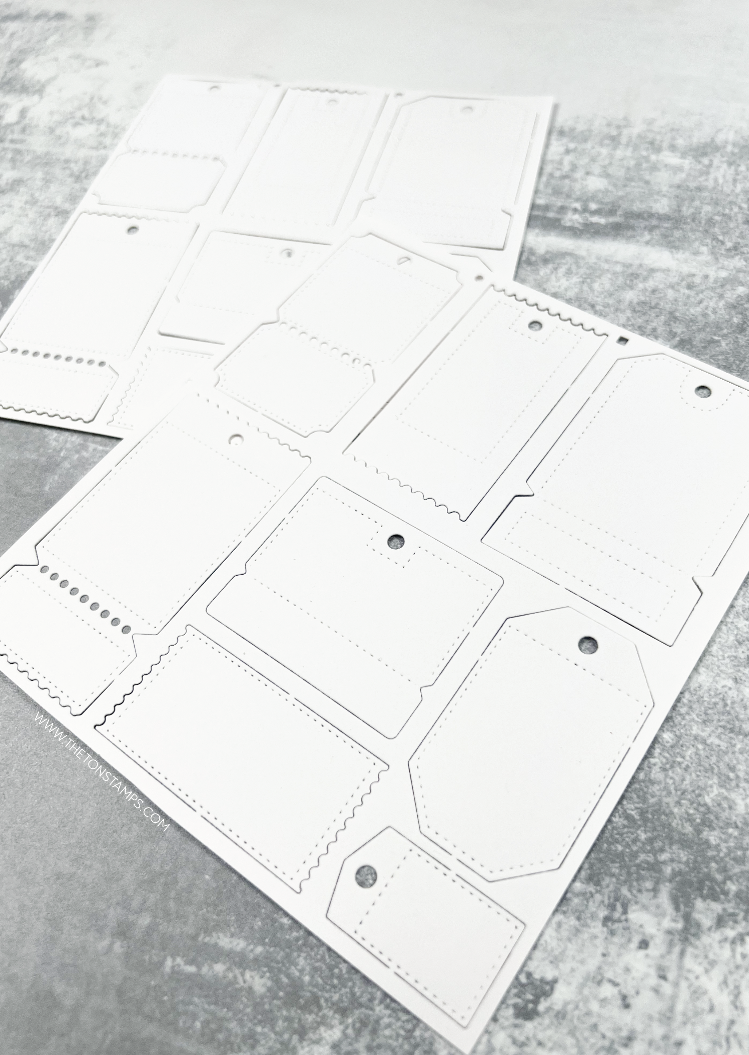 Mass Tags Dies include 2 metal dies. The main die (measuring approximately 5.4 x 6.1) will cut out 8 tags/tickets at once. Tags/tickets will stay on the negative piece to keep everything together so that you can use the coordinating stencils (sold separately here) on top of the die cuts. The second die (measuring approximately 0.2 x 1.5 inches) will cut out round reinforcement rings. Use with our Humorous Tags Sentiment stamps
