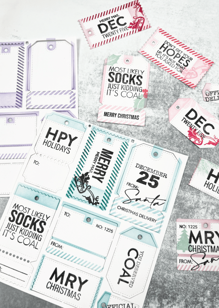 Mass Tags Stencils will create a number of tags using 2 stencils. The larger main stencil measures approximately 6.75 x 7.2 inches. The smaller stencil measures approximately 2.5 x 3.5 inches. Coordinating dies are sold separately here. Use with our Humorous Tags Sentiments stamp set sold here.