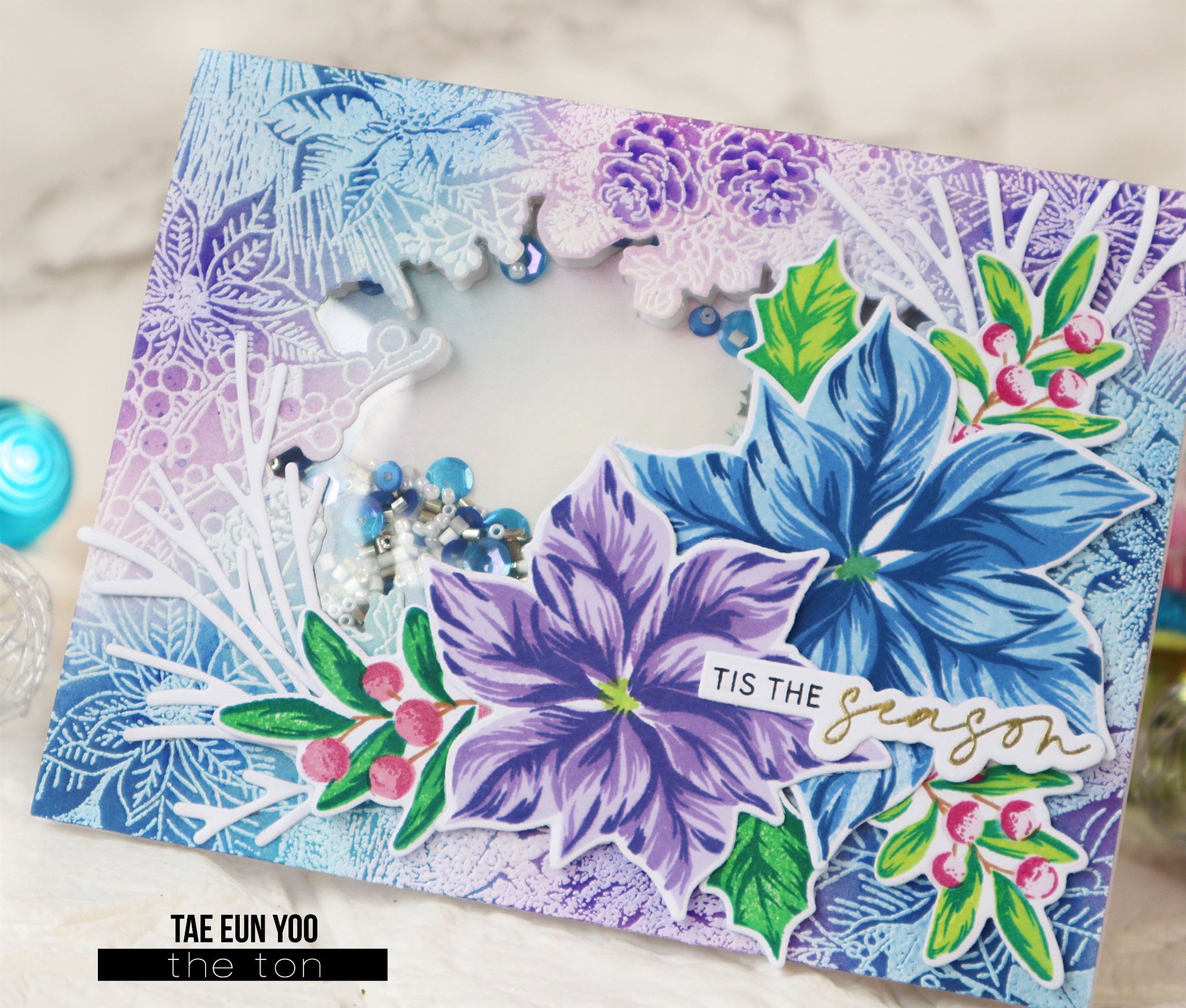 Anyway, once I am done with the stenciling, I die cut them with the coordinating dies of each set. Put aside all the pieces. Using one of the circle from Circle Nested Dies, I die cut a circle on a piece of scrap paper and use this as a stencil to create the circle focal point of the card. Arrange the pieces around the circle. Adhere with glue and some with foam adhesive to create depth. Finish with some enamel drops.
