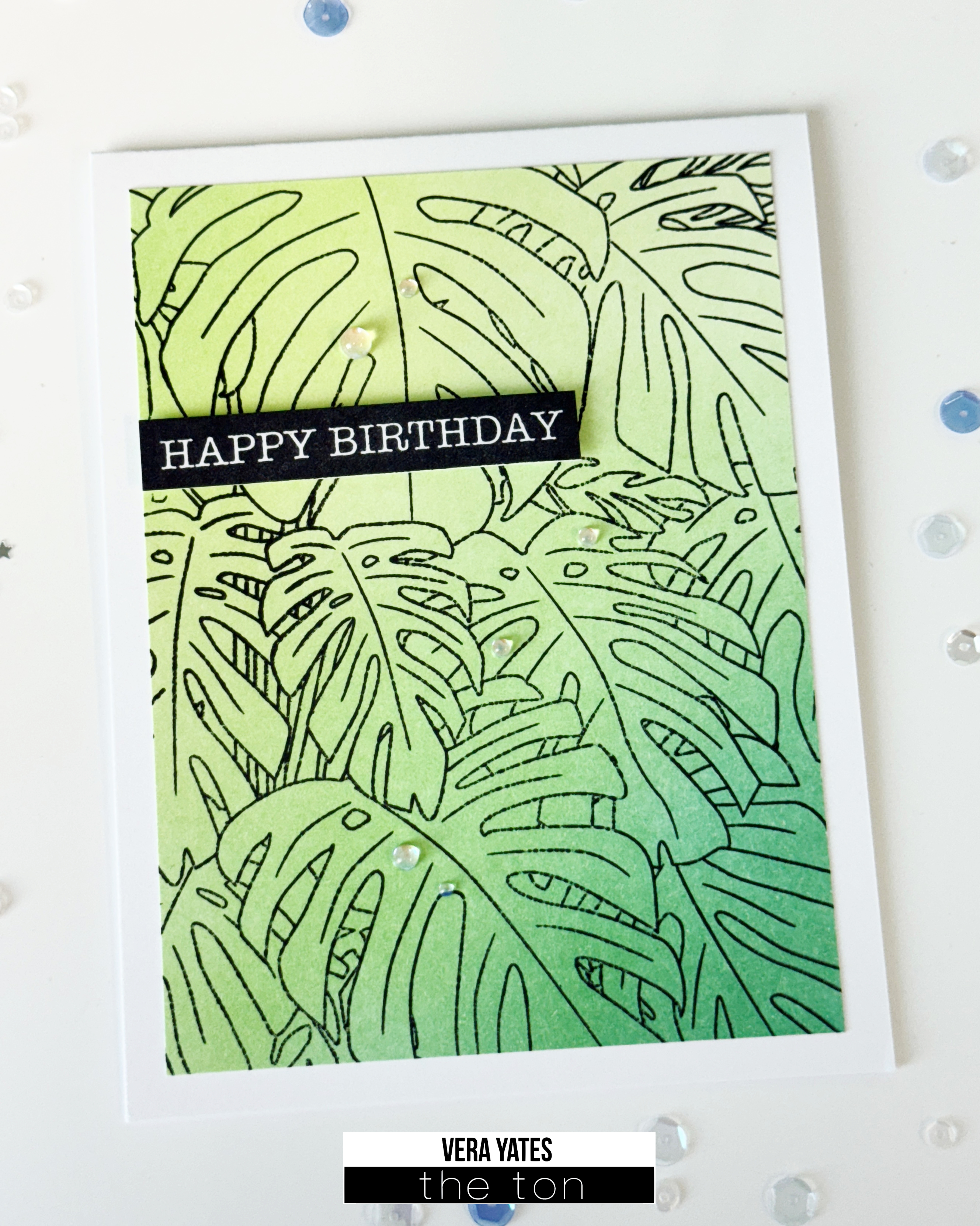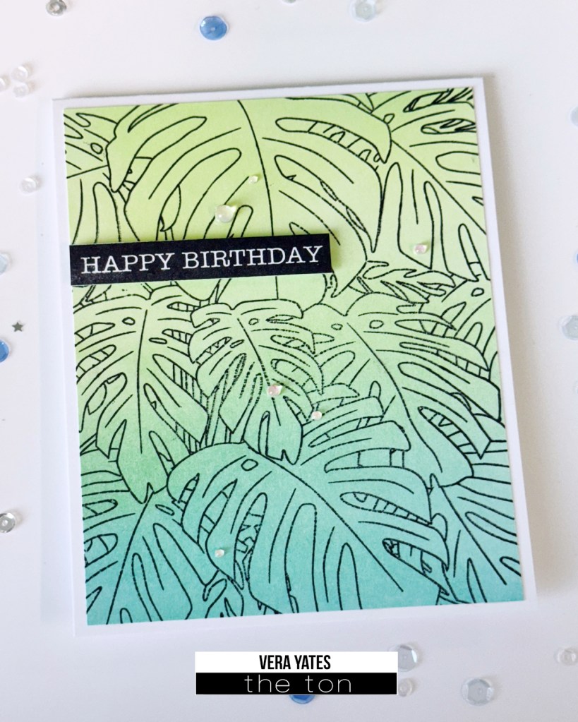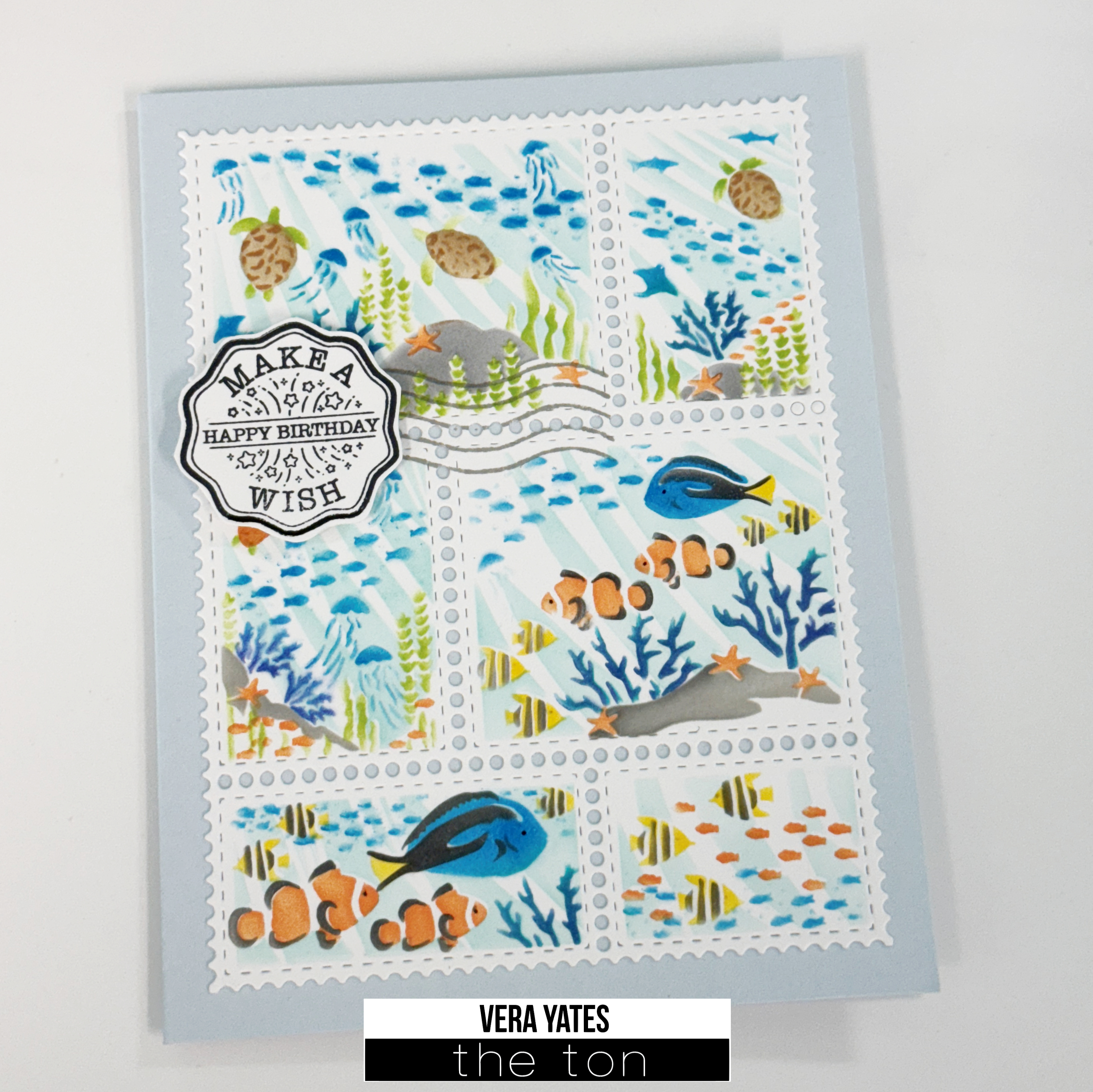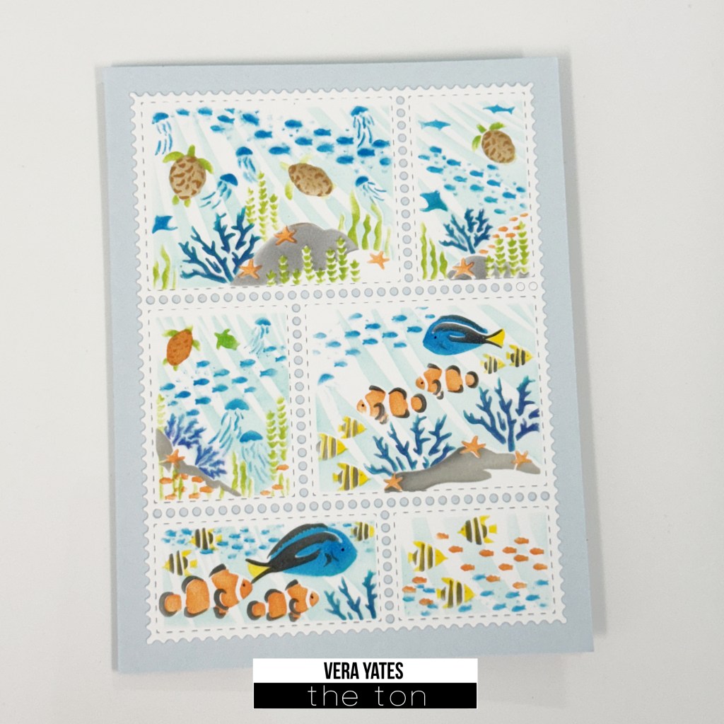 This card is pretty straight forward. I die cut the postage background using Postage Party die set. Then I laid the blank panel on The Ton Grip Mat and layered the stencil on top of it. The mat help keep the stencil in place and I also dab any extra ink on the brush to the mat. For the ocean I used Blue Diamond. For the blue fish I used Parisian Blue and Caviar for the body. For the tail I used Lemon Drop (I also used this color for the yellow and black fish). For the clown fish & starfish I used Coralline and Caviar. For the coral I mixed Parisian Blue with Ocean Teal. For the seaweed I used Meadow. Of course, the beauty of making cards is you can always use your color of choice. Go wild!